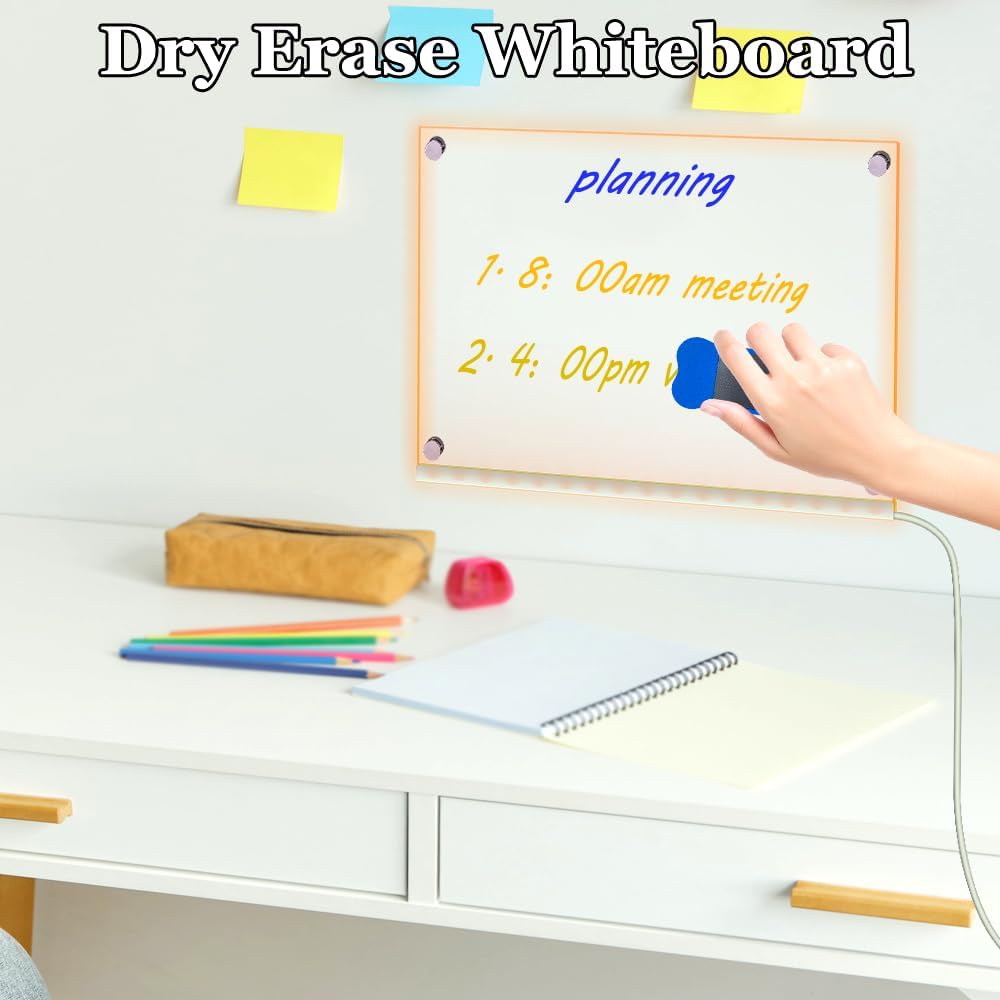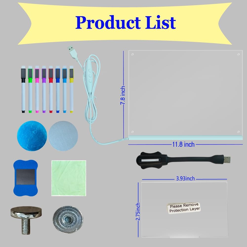1 x Acrylic LED Dry Erase Board8 x Magnetic Coloured Markers(black, green, pink, purple, red, 2 blue and yellow)4 x Stickable Magnet Sheet1 x Magnetic Eraser2 x Cleaning Rags4 x Screw Nail & Magnetic Screw Cap1 x Acrylic Mini Dry Erase Board1 x Mini USB Lamp
