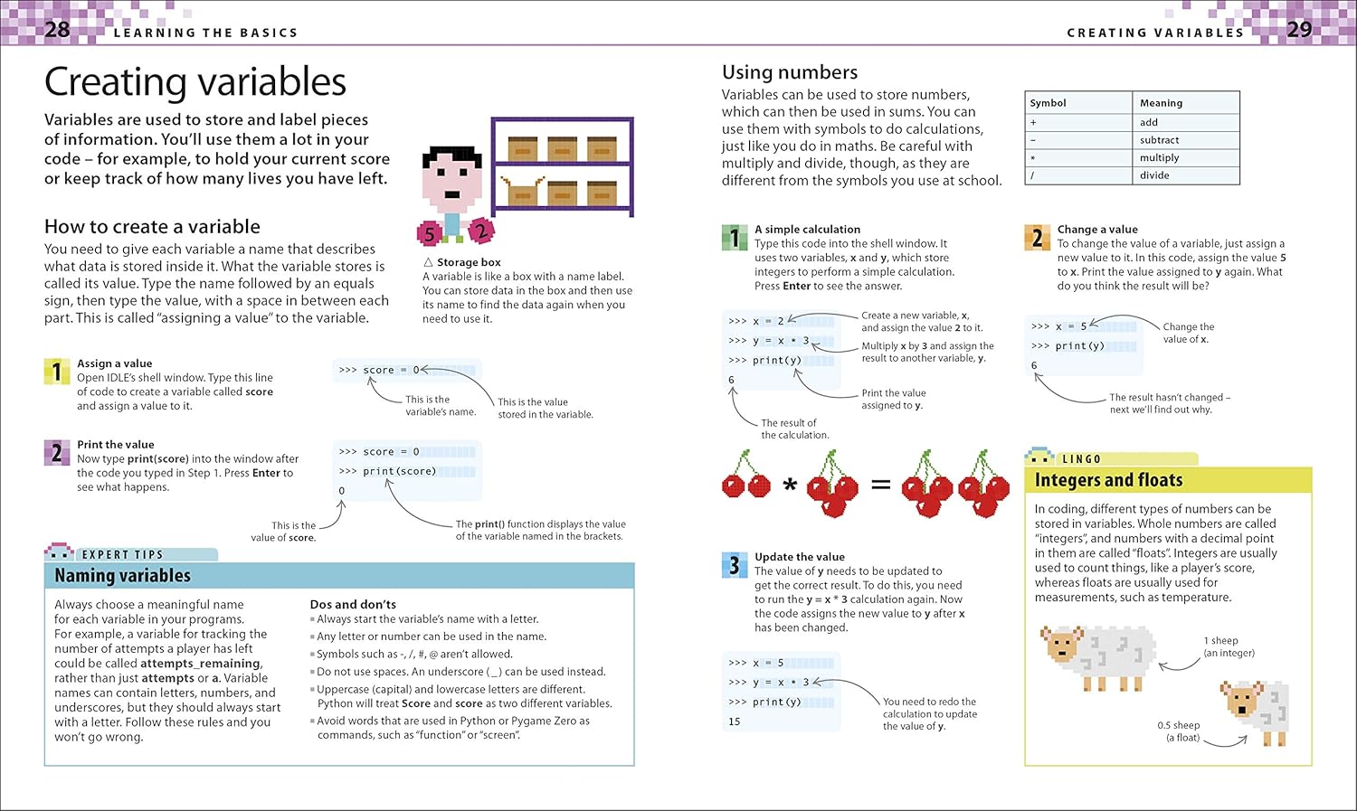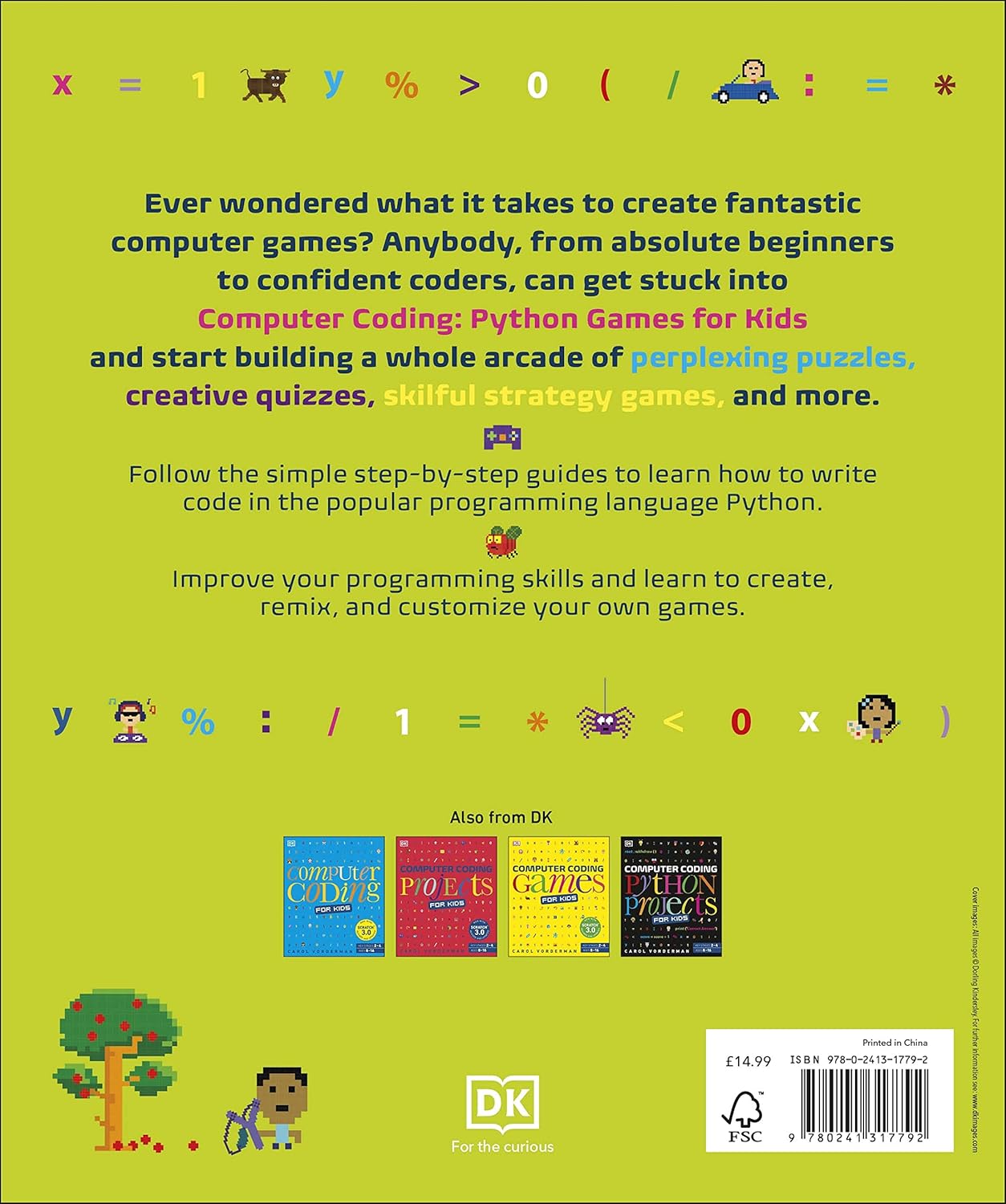 Learn how to code in Python by building and playing your own computer games, from mind-bending brainteasers to crazy action games with explosive sound effects and 3D graphics. Whether you’re a seasoned programmer or a beginner hoping to learn Python, you’ll find Computer Coding Python Games for Kids fun to read and easy to follow. Each chapter shows how to construct a complete working game in simple numbered steps. Using freely available resources, such as PyGame Zero and Blender, you can add animations, music, scrolling backgrounds, 3D scenery, and other exciting professional touches. After building the game, find out how to adapt it to create your own personalised version with secret hacks and cheat codes! Along the way, you’ll master the key concepts that programmers need to write code – not just in Python but in all programming languages. Find out what bugs, loops, flags, strings, tuples, toggles, and turtles are. Learn how to plan and design the ultimate game – and then play it to destruction as you test and debug it. Before you know it, you’ll be a coding genius!