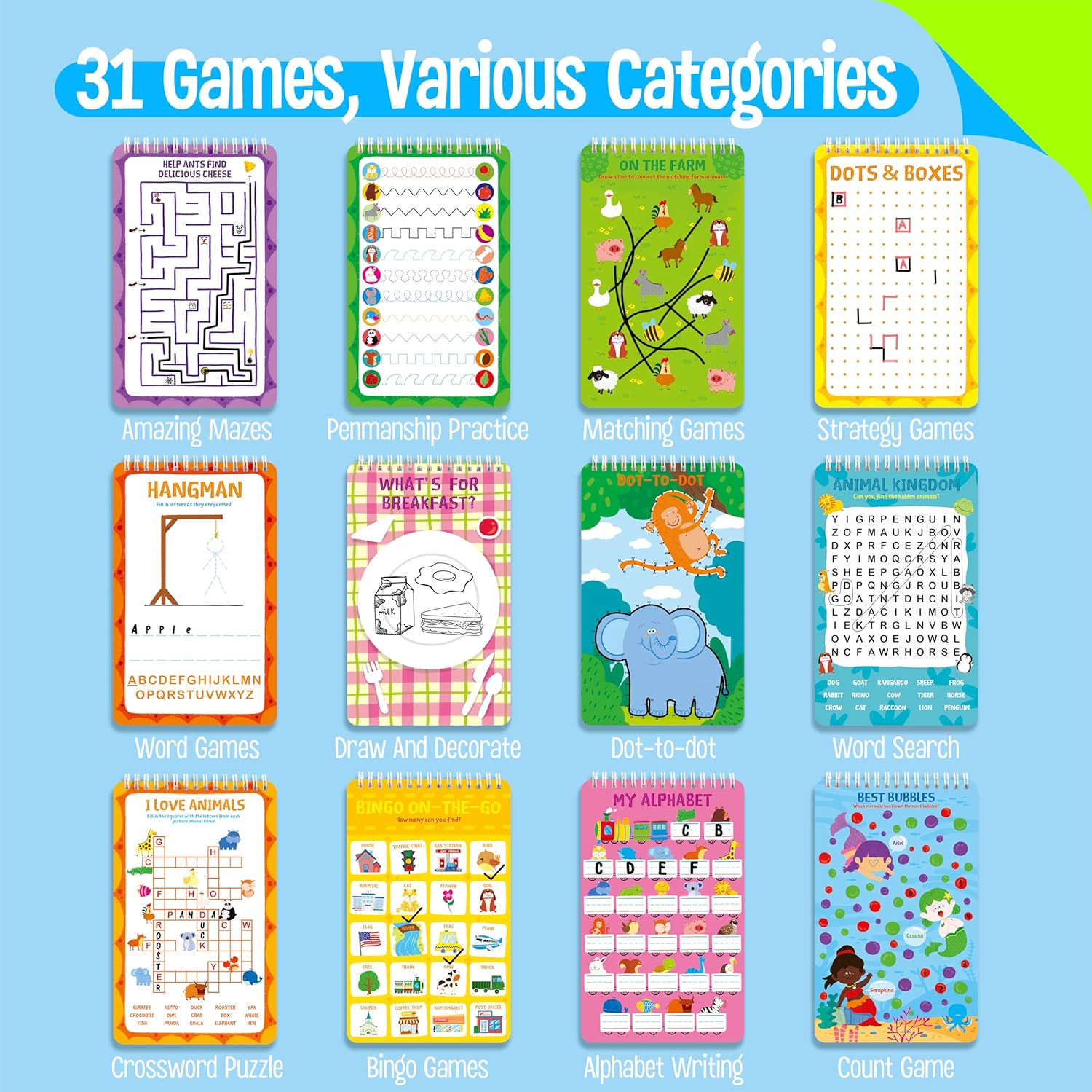 31 Dry Erase Activities Book, Reusable & Erasable Game Pad, Explore and Find, Maze Matching TIC-TAC-Toe Dot to Dot Words Interesting Educational Toy and Learning Tool for Road Trip Airplane Travel