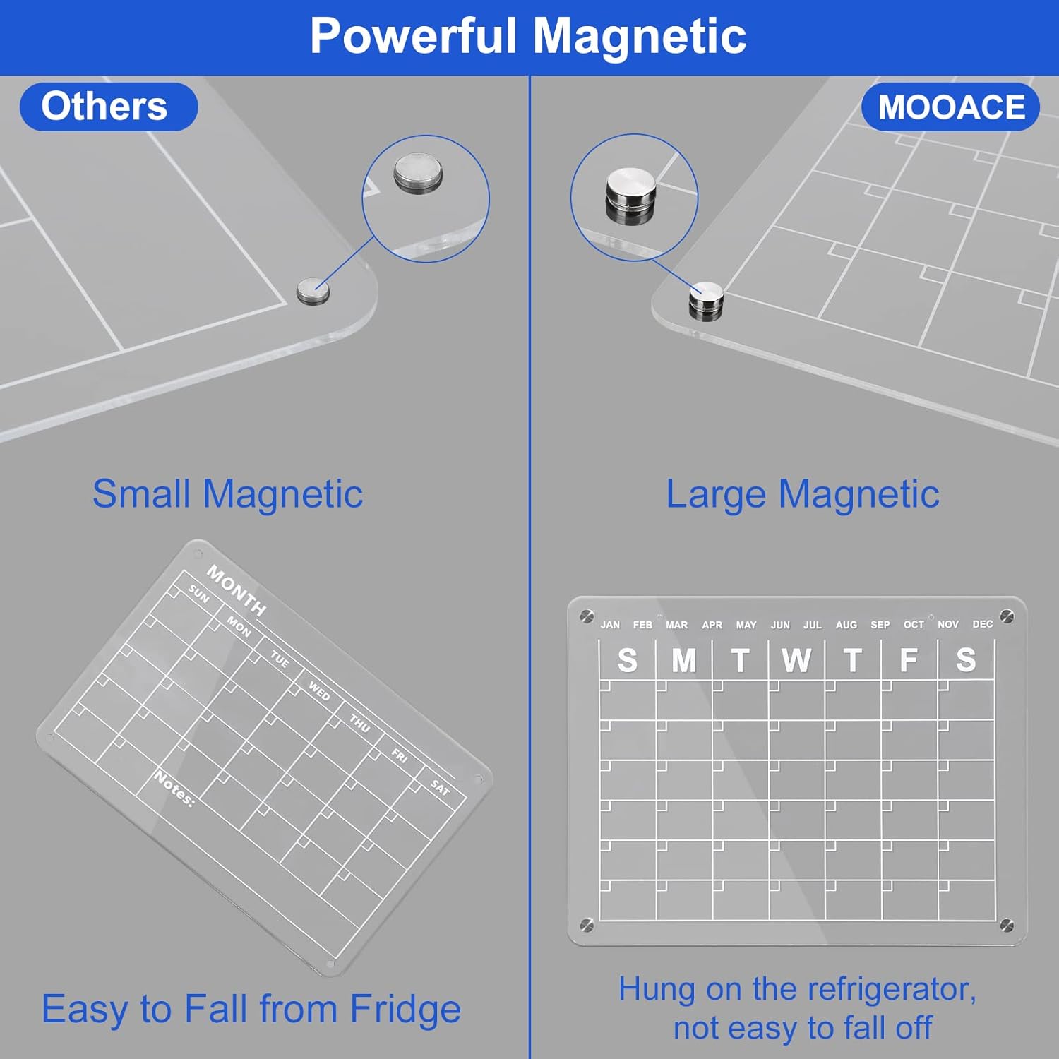 Magetic Dry Erase Calendar : Acrylic calendar for wall and fridge is made of high quality acrylic board, the simple,stylish and transparent design helps you to plan your daily life easily, write your plans on the calendar board as a perfect memo, the 16*12 inch size suitable for hanging on your refrigerator.Note: The magnet of this acrylic board is not available for non-magnetic stainless steel fridge or curved fridge/refrigerator.