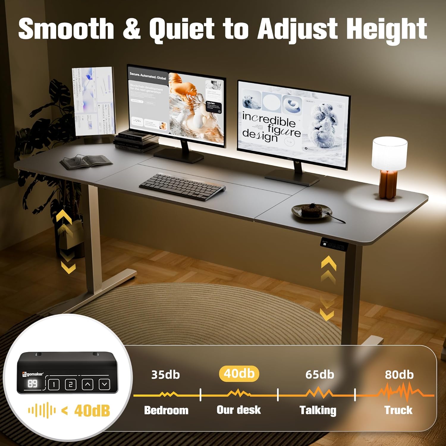 【SOLID CONSTRUCTION】The height-adjustable desk is made of heavy-duty steel, with a weight capacity of 70KG(154lbs) and travel speed of 14mm(0.6″)per second, keeps the desk stable even when it rises to the highest point. The soft start/stop functions make the desk move smoothly and quietly (<50dB).