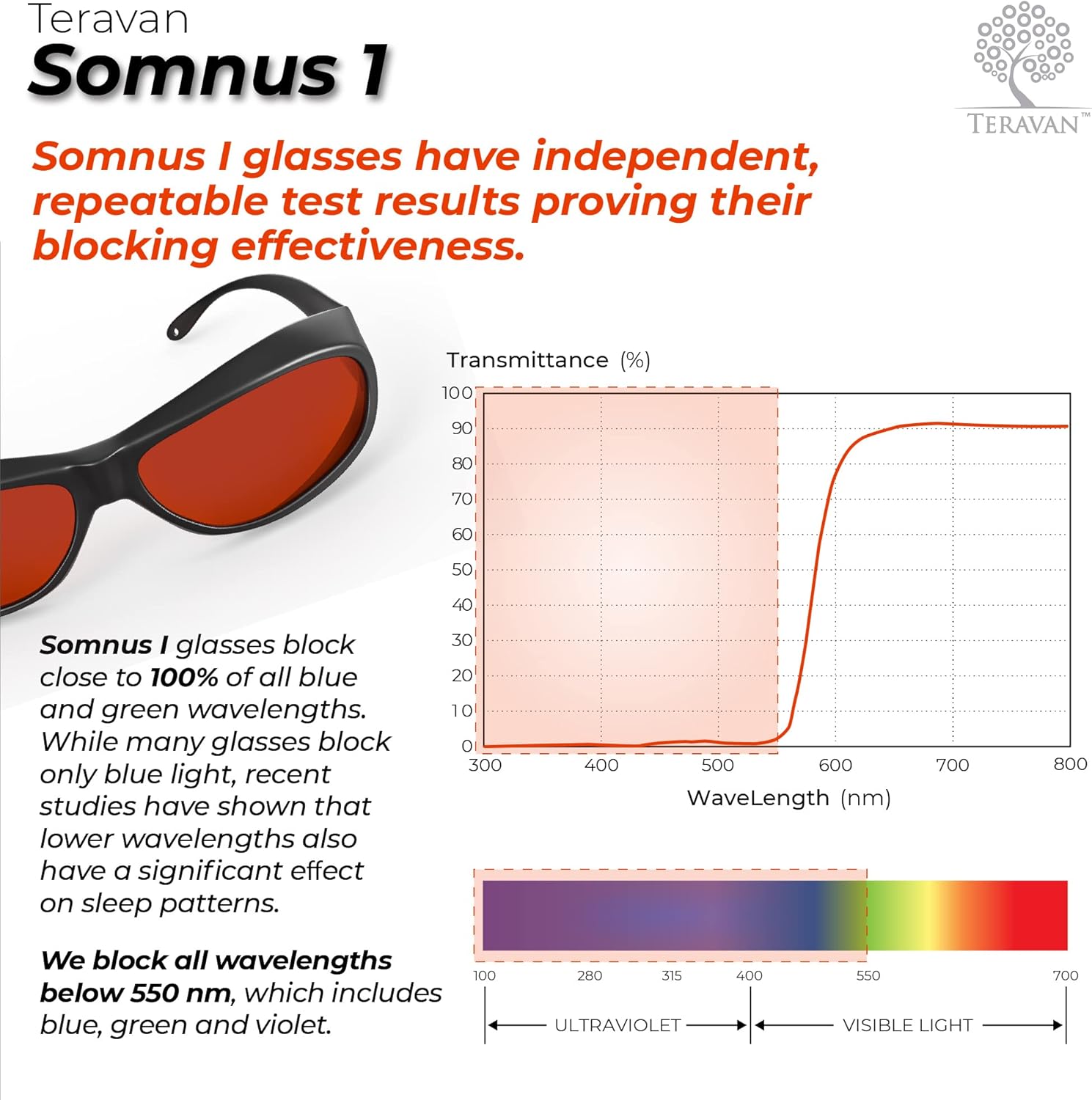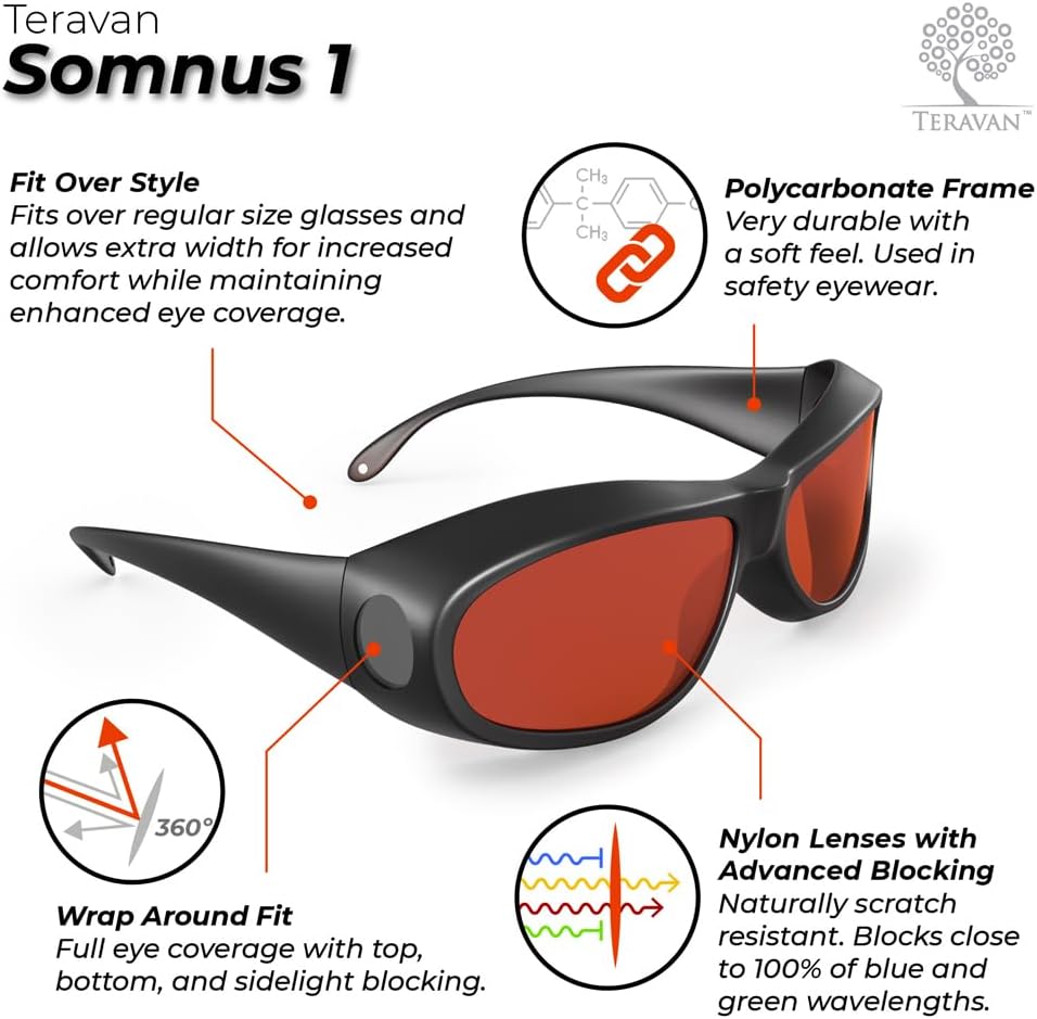 It is rare and usually a lot pricier to block such a wide spectrum of sleep-disruptive light. So I found that impressive and bought two pairs. I also really like the shape of the fit-overs; they’re much more attractive than the abundant square ones. A few things to bear in mind:*The small lens built into the sides is not red but an extremely pale grey. This is suitable because the light that enters your eye frontally is what really matters. Generally side-glare, even if there is a lot of light, will not be sufficient to reflect into the eyes in a way that will disrupt hormones. The little grey windows allow a bit more light in for reading while still toning it down slightly to ensure you don’t get that reflection.*The glasses should be lighter weight and/or have a nice cushion. If you combine them with readers or prescription glasses, it’s going to get heavy after a while. Also, I feel like the weight loosened the hinge on my readers in the first night(!). Although glasses that only block blue light are of minimal effect for me, I do find myself rotating those ones in and out with these to give my nose a break, which is tremendous a shame.*Compared to some fit-overs their construction is not too overly wide and so is more suitable for a woman’s face. And even without my readers on, the design holds onto me far better than I anticipated.*Be sure that the glasses you wear underneath are clear without any computer-coating or light-blocking, or you may strain your eyes because of the dimness.* The biggest ongoing frustration with these glasses has to do with the lens material. It attracts grime and is nearly impossible to get completely clean, also the lenses readily pop out while cleaning. Both of these factors contrast unfavorably to my bon charge readers and to my regular readers, although I’d say that BluBlocker sunglasses also get very grimy and resist cleaning.*It was initially disconcerting that my blue light devices tended not to go neutral with these glasses on. Some looked as bright or brighter with the remaining light that came through as they did with glasses that just block blue light (Uvex Skyper or Swanwick). Other blue light devices looked purply-blue, whereas the blue light blockers left them greenish. I wondered if these lenses were merely dying everything red and not really blocking. But apart from the sellers reply to my question here on Amazon, I did several experiments: I have a blue led device that is quite bright and had it on in a closed cabinet in a closed room with no windows. Opening the cabinet multiple times with each pair of glasses on, it was clear that more total light was coming through with the glasses that block blue light only. Next I took a blue light detecting card and a blue light (such as come with some computer glasses to prove that they block some of the light), and I held the glasses right against the card with the light on top of the lens for ten seconds. The Uvex glasses left a purple mark briefly (indicating some light had gone through), but the Teravan did not. I also shone the blue light through each lens: It looked green and moderate on the Uvex and dim and orange on the Teravan. These experiments convinced me that the Teravan were in fact blocking more blue light, not less, and that the bluish and purplish lights are just a factor of what it looks like with less green and UV.