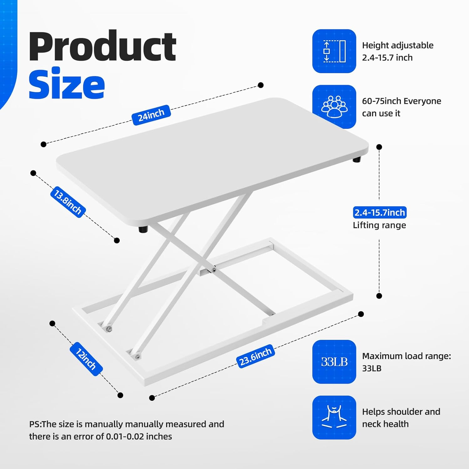1.Our standing desk converter converts a traditional desk into a multifunctional workstation that can alternate between sitting and standing, the desktop measures 24 inches long and 13.8 inches wide the compact design is ideal for office workers, helps improve posture, reduces stress on the neck, back and lumbar region, supports healthier office habits and reduces health risks