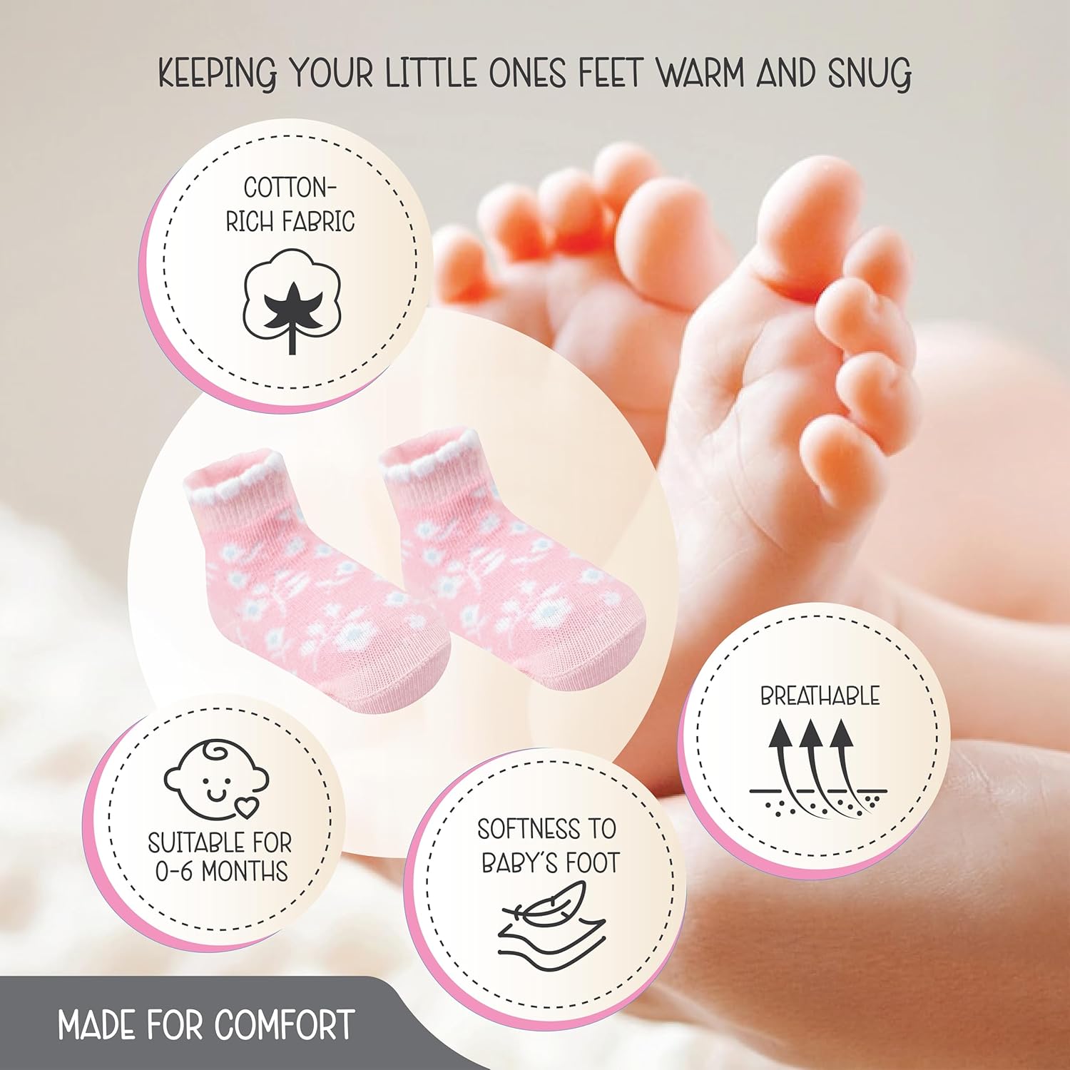 True to Fit: Infancie newborn socks are made to suit your child’s growing feet perfectly. The elastic material ensures a snug fit without feeling too tight, keeping your baby comfortable all day. Furthermore, our socks are true to size, so you can be confident that they will fit