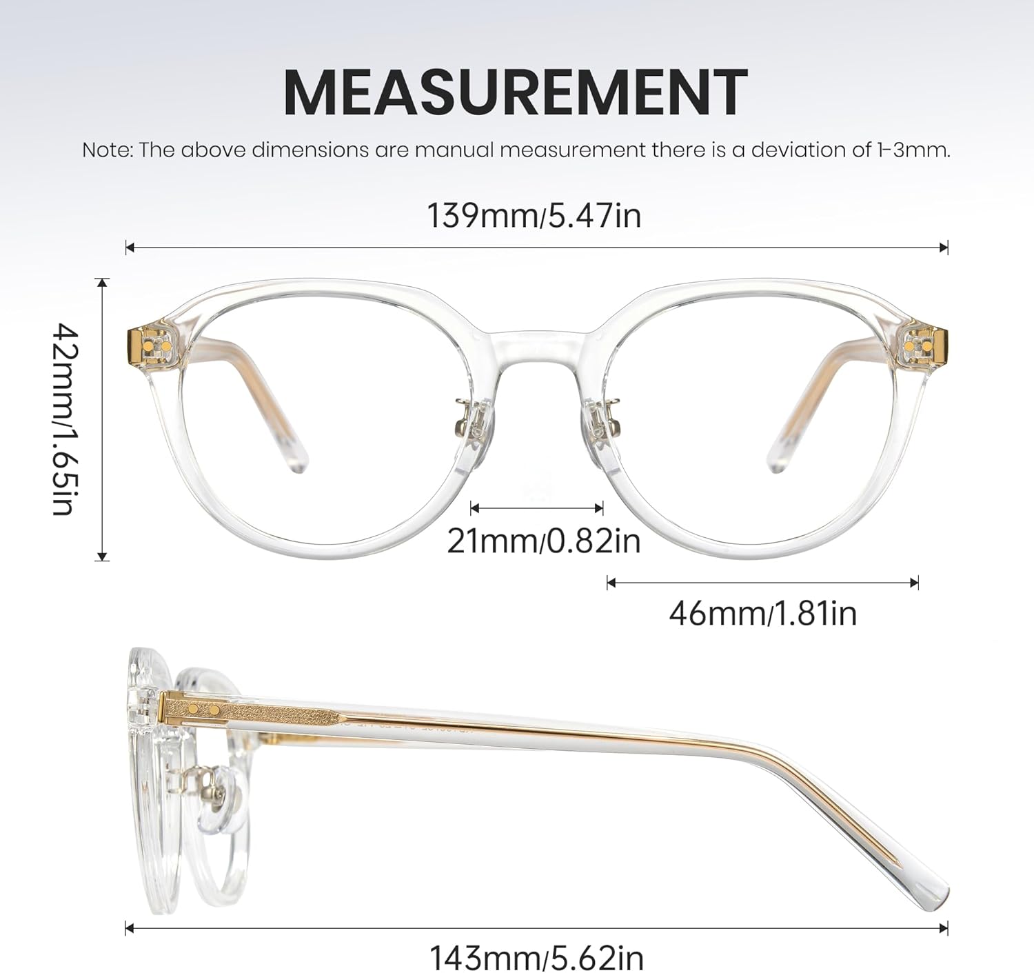 I love this glasses. They are a little big, i think 50 or 51mm, and round. I bought the light blue and red color. The red is bright, like a strawberry color and the blue good great with my jeans. I have a medium size face and they look big but i like that style. They don’t fall from my nose. It’s plastic but doesn’t look cheap. They have a little yellow coating and I see some customers they dont like it but it doesn’t bother me.