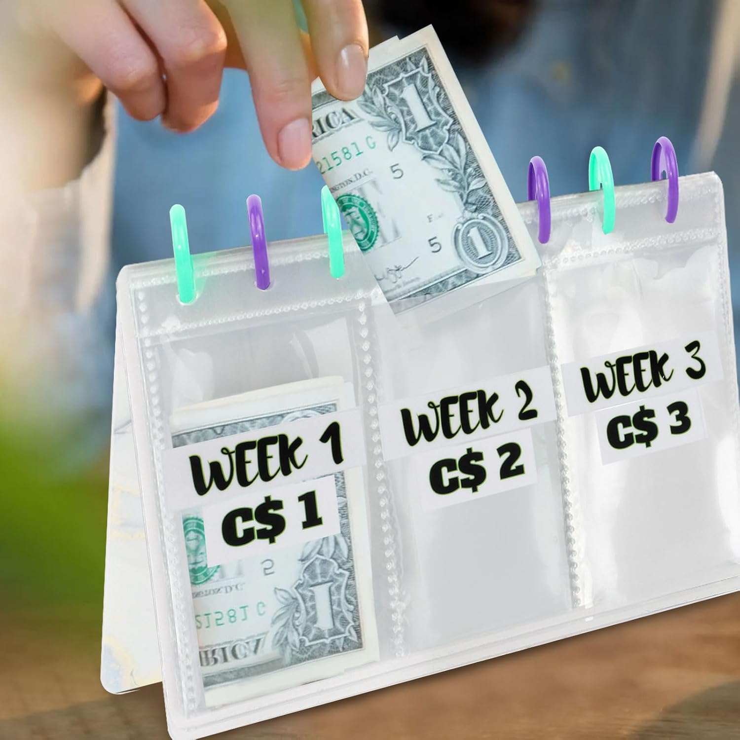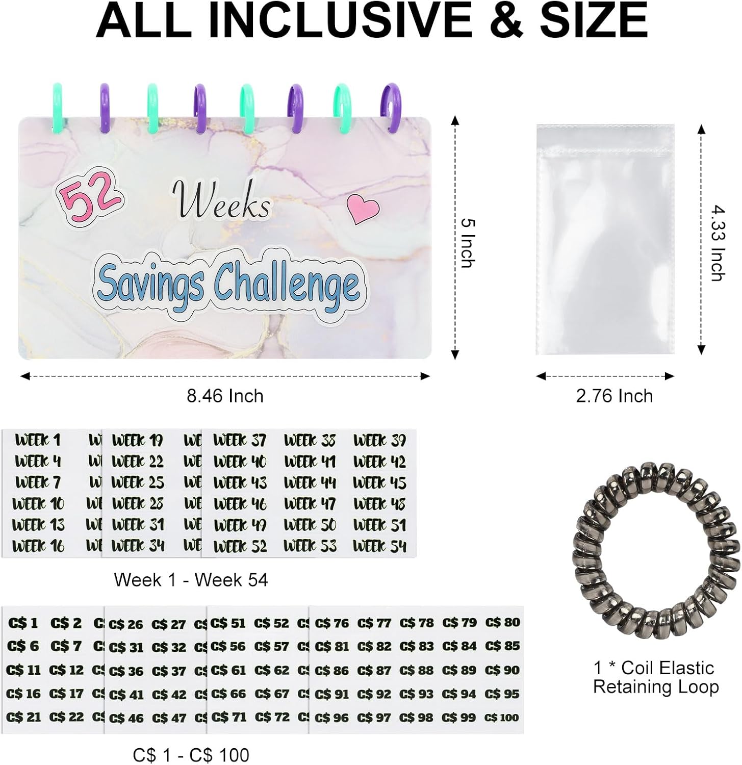 💖【Thoughtful Matching】Comes with 7 stickers containing week1~week54,$1 CAD~$100 CAD, so you can customize the amount of money you save as a challenge goal for different weeks of the challenge, and of course, it will either keep on increasing or decreasing, it’s up to you. Also included is an elastic clip for fastening, which ensures that your binder fixing won’t be opened, making your journey to saving money safer and more secure.