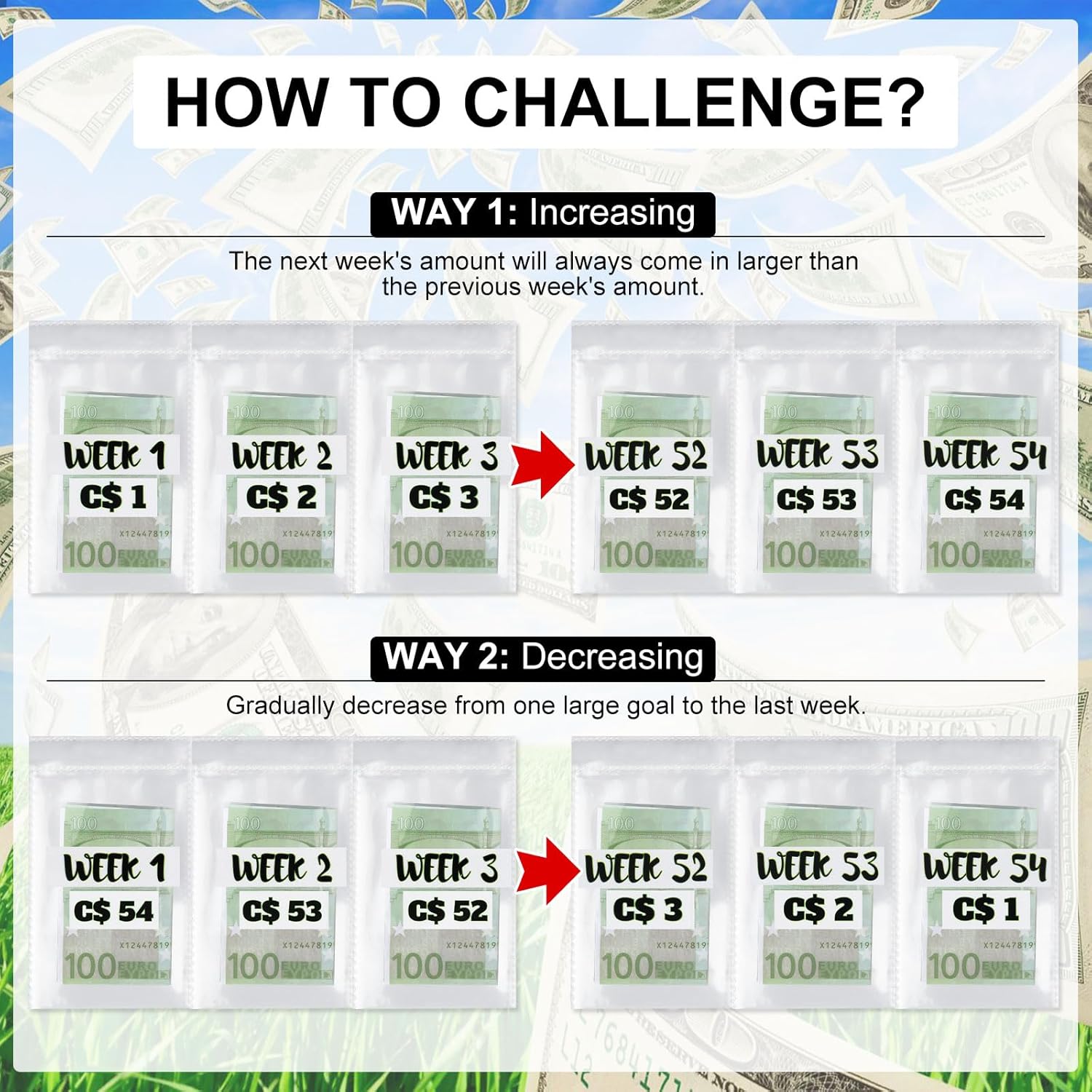 👛【Multiple Challenge Approaches】A typical 52-week money challenge would be for you to save $1 CAD the first week, $2 CAD the second week, and so on. Or, you can reverse the challenge, which means you save $52 CAD the first week, $51 CAD the second week, and so on. By the end of the year, you will have saved $1,378 CAD. This is definitely a great way to save money because, by the time the holidays roll around, you’ll be able to pay for your Christmas gifts!