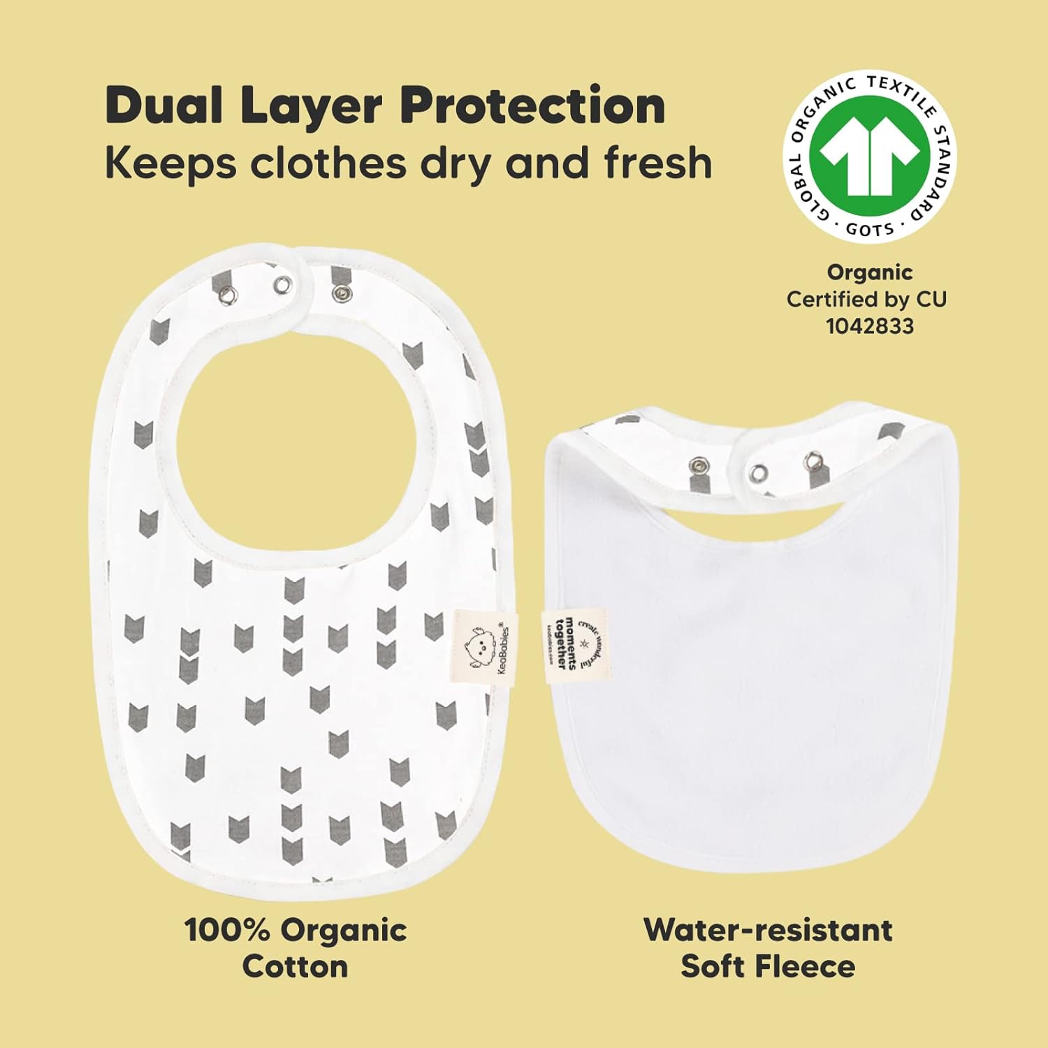 Super Absorbent – Our stylish organic baby boy and girl bibs are made with 100% organic cotton (GOTS-certified) and backed with water resistant fleece for added absorption. This dual layer design helps to keep your baby’s clothes clean and fresh all day long, which means less laundry for you! Suitable for newborns, infants, toddlers, heavy droolers and teething babies.