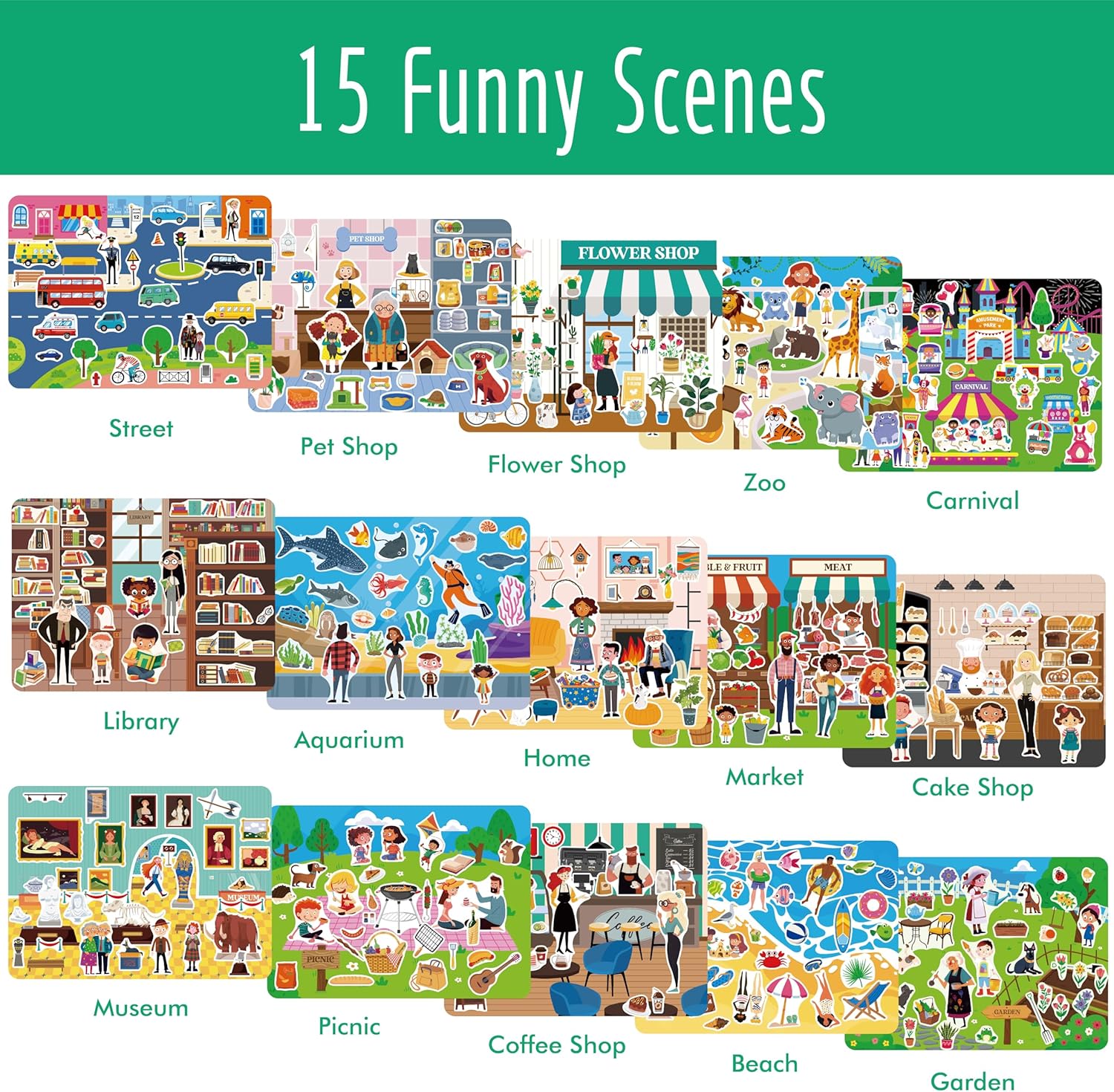 Explore Different Scenes: The town activity book contains 15 colorful and detailed sticker scenes, including street, pet shop, flower shop, zoo, carnival, library, aquarium, home, market and more. It takes children on an adventure through a vibrant and bustling town. With various scenes and locations to explore, it sparks curiosity and imagination in young minds.