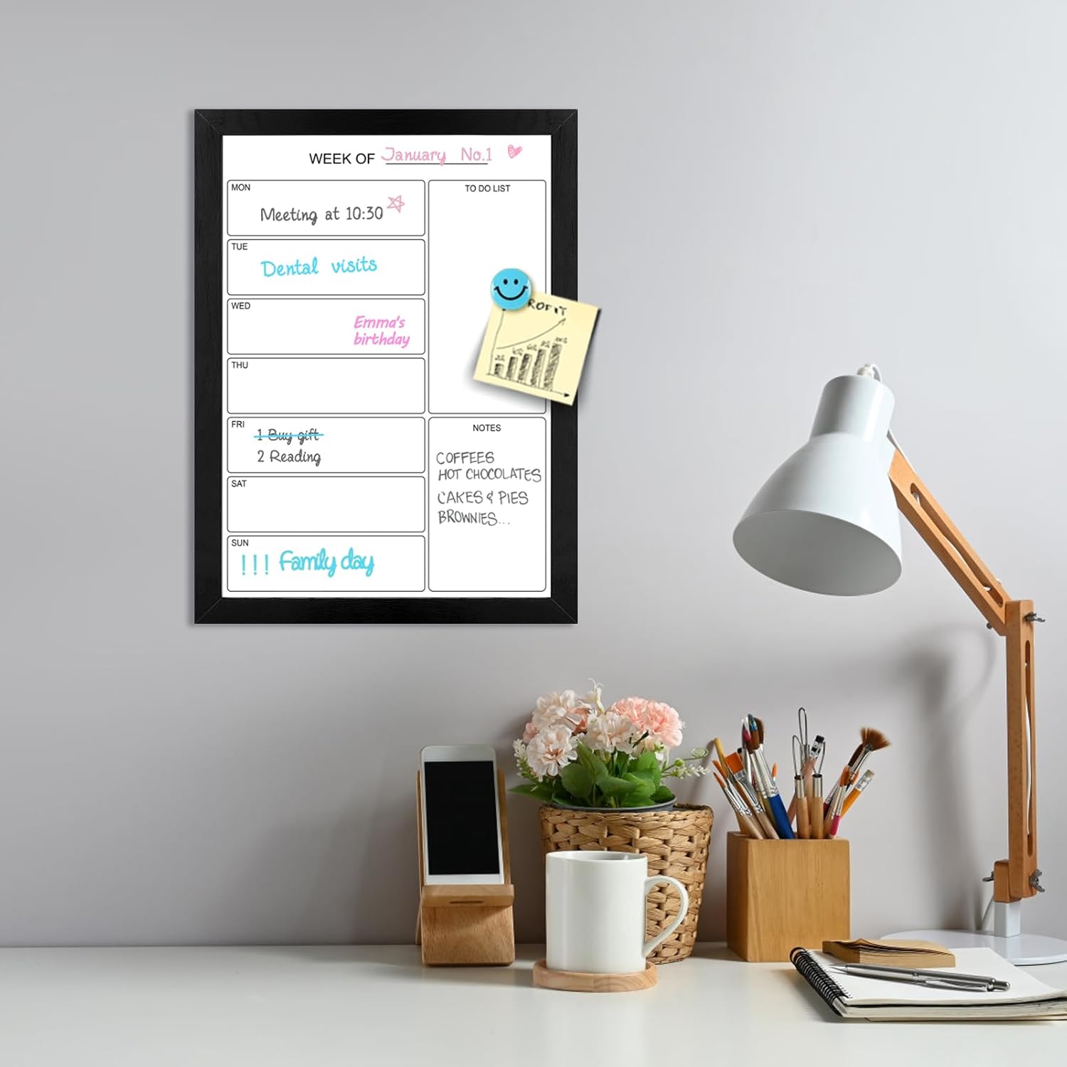 Premium Materials & Unique Design: The premium magnetic dry-erase surface is highly durable, never stains or ghosts, and erases easily. A black wooden frame makes this weekly planner look very unique and stylish