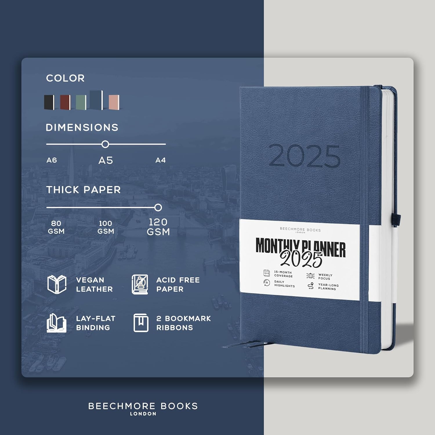 Wish you could keep track of your goals, appointments, and to-do lists all in one place? Academic planners are an essential tool for anyone striving to stay organized and productive. Beyond professionals and students, it’s also perfect for busy individuals juggling family schedules, entrepreneurs managing projects, or anyone who values mindful planning. Imagine the effortless satisfaction of working with a premium grid-lined notebook, where luxurious, thick paper prevents ink bleed, ghosting, or smudging, keeping every line crisp and professional. The precise grid layout ensures flawless alignment, transforming your ideas into a masterpiece of clarity and elegance. Make your life more organized and stress-free with the Beechmore Books A5 Monthly Planner. Our A5 goal tracker planner, beautifully bound in vegan leather, is designed for those who value structure and style. With 160 pages of thick 120gsm cream paper, this travel organizer ensures no ink bleed, ghosting, or shading, giving you a smooth writing experience every time. Our portable productivity tool includes a full-year overview (15-month coverage), double-page spreads for each week, and ample space for daily entries, to-do lists, appointments, and goal-setting. The thoughtful layout helps you manage tasks, plan ahead, and track progress with so much ease. Sophisticated Design: Elegant vegan leather cover adds a touch of luxury. Perfectly Portable: Compact 8.3 x 5.8″ size fits seamlessly into your daily routine. Highly Versatile: Ideal for professionals, students, and multitaskers. Goal-Oriented Focus: Keeps you organized and aligned with your daily objectives. Here are more reasons to love our 2025 planner: – Comes in a signature gift box – Suitable for men and women – Offered in a variety of colors Make 2025 your most productive year. Add the Beechmore Books A5 Monthly Planner to your cart NOW!