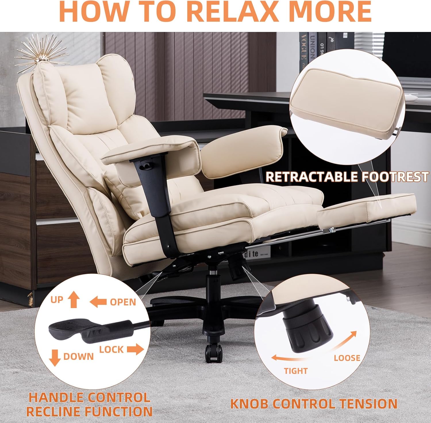 【Product Description】 1. 【Ergonomic Design for Ultimate Comfort】 This executive office chair is designed with your comfort in mind. Featuring an ergonomic high backrest and built-in lumbar support, it provides excellent posture support for long hours of work, study, or gaming. The dual-layered, high-density sponge seat cushion ensures a soft yet supportive sitting experience, while the PU leather upholstery adds a touch of elegance to your workspace. 2. 【Adjustable & Reclining Features】 Customize your sitting experience with the height-adjustable seat, 360° swivel, and tilt tension knob. The reclining backrest allows you to lean back up to 135°, and the retractable footrest provides added comfort for relaxation or napping. Whether you’re working hard or taking a break, this chair adapts to your needs. 3. 【Heavy-Duty Construction for Big & Tall Individuals】 Built to last, this heavy-duty office chair supports up to 500 lbs. The sturdy metal base and reinforced frame ensure stability and durability, while the SGS-certified Class 3 gas cylinder guarantees safety and reliability. The smooth-rolling, wear-resistant casters protect your floors and allow easy movement. 4. 【Stylish & Versatile】 Available in multiple colors and styles, this office chair complements any home or office decor. The sleek PU leather design is not only stylish but also easy to clean, making it a practical choice for everyday use. Whether you’re in the office, at home, or gaming, this chair combines functionality and aesthetics. 5. 【Easy Assembly & Worry-Free Support】 Setting up your new office chair is quick and easy with our step-by-step assembly video. All necessary tools and hardware are included, and most customers can complete assembly in just 15-30 minutes. If you have any questions or concerns, our customer support team is here to help. Enjoy peace of mind with our reliable product and excellent service.