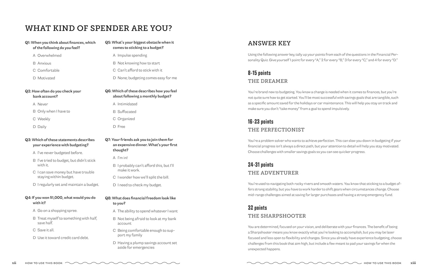 How do you spend and save?―Take a quiz to find out whether you’re a Dreamer, a Perfectionist, an Adventurer, or a Sharpshooter when it comes to budgeting, and which activities might be best to start with.
