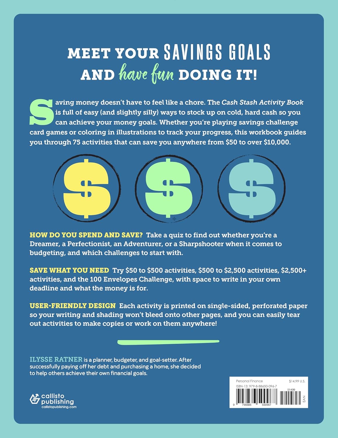 High-quality and fun to use―Every activity is neatly printed on a single-sided piece of perforated paper so your writing and shading won’t bleed onto other activities, and the pages are easy to tear out so you can make copies, hang them up where you can see them, or work on them anywhere! This savings challenge book also makes a great tool to use in tandem with your favorite calendar or organizer as you track your goals for the week, month, or year.