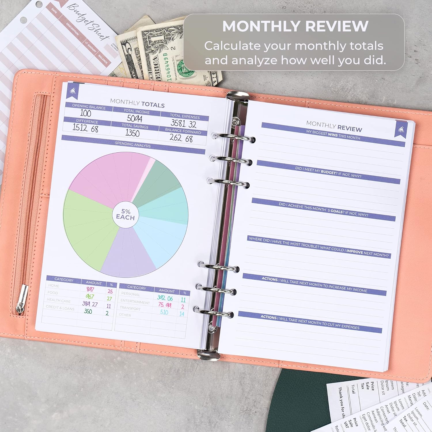 STORAGE POCKETS, CASH ENVELOPES & BUDGET SHEETS – The budget organizer has 9 storage pockets to store cards and other loose items; 12 tear- and water-resistant cash envelopes; and 12 budget sheets for tracking your monthly spending.