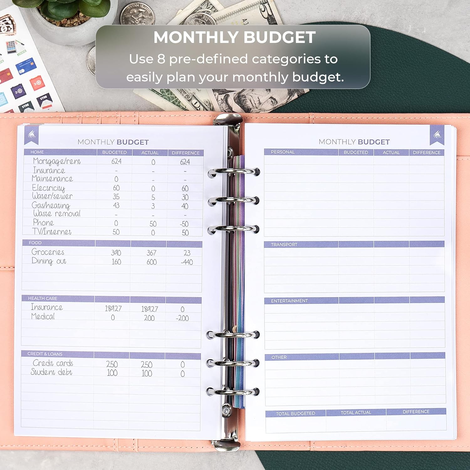 PLAN YOUR MONTHLY BUDGET & TRACK EXPENSES EASILY – This finance planner is undated and lasts 12 months, with pages to plan your monthly budget, track expenses, debts, bills, and savings, plan your holiday spending, and reflect on your performance.