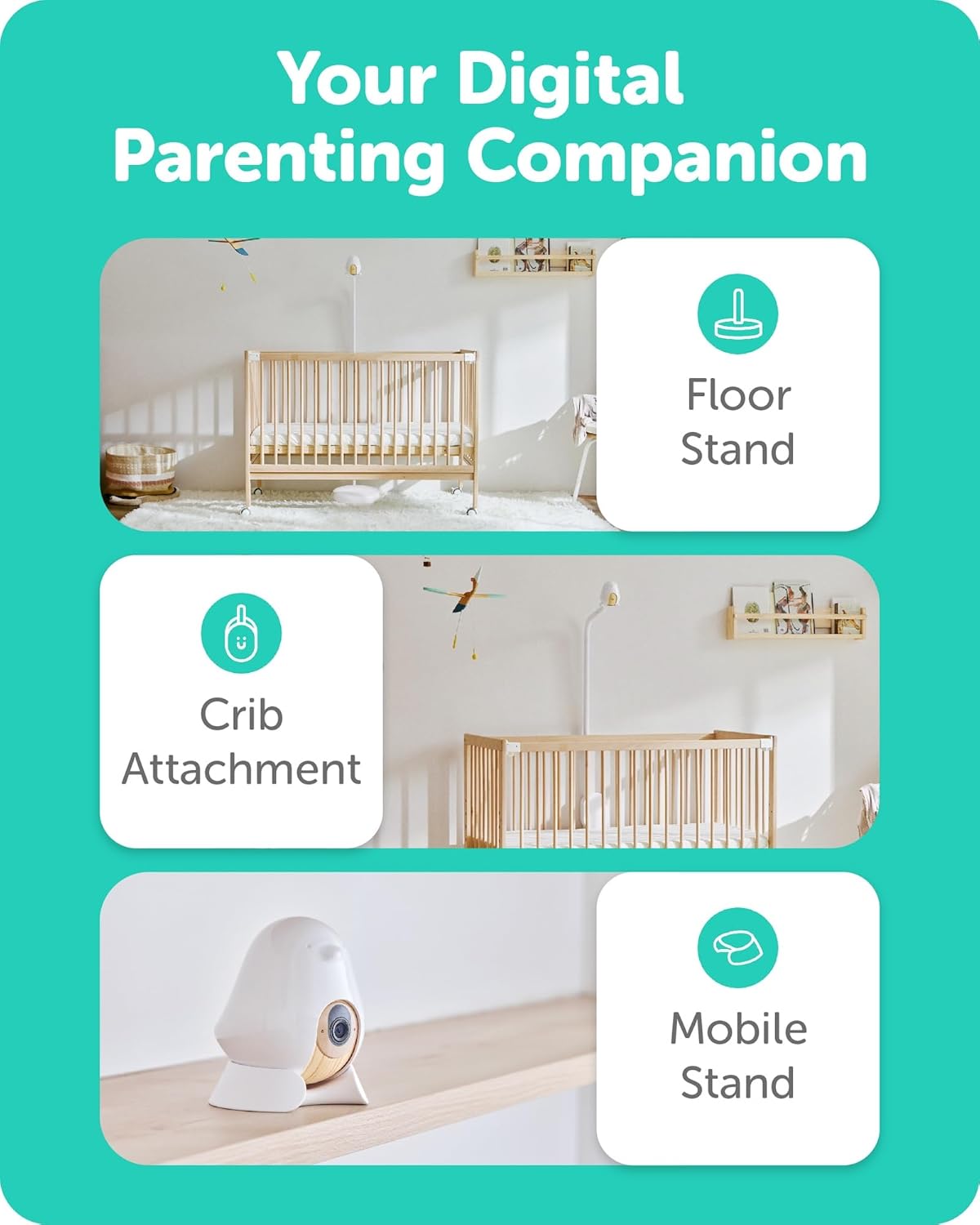 Includes a Sleep Sensor Pad and a CuboAi Plus camera that comes with 1 shared stand, a floor base, a crib attachment, and a mobile stand.