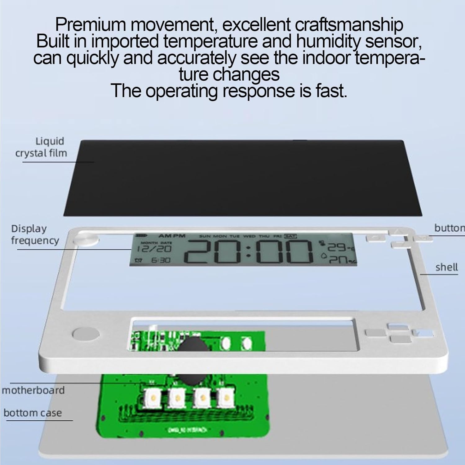 Multifunctional Display: The desktop digital calendar on the LCD screen shows time, date, day of the week, temperature, and humidity. It allows for easy switching between 12/24 hour format and Fahrenheit/Celsius conversion.