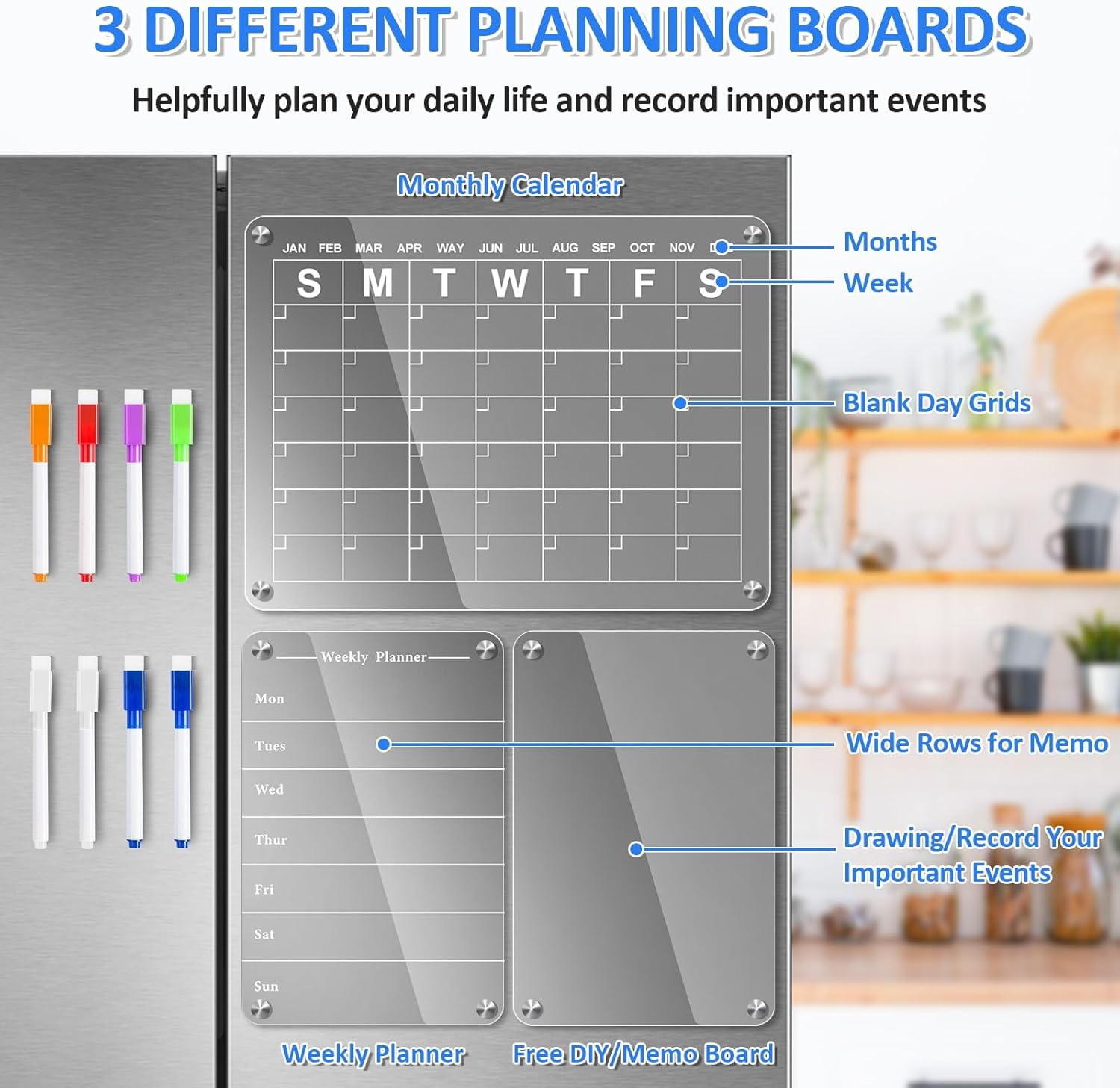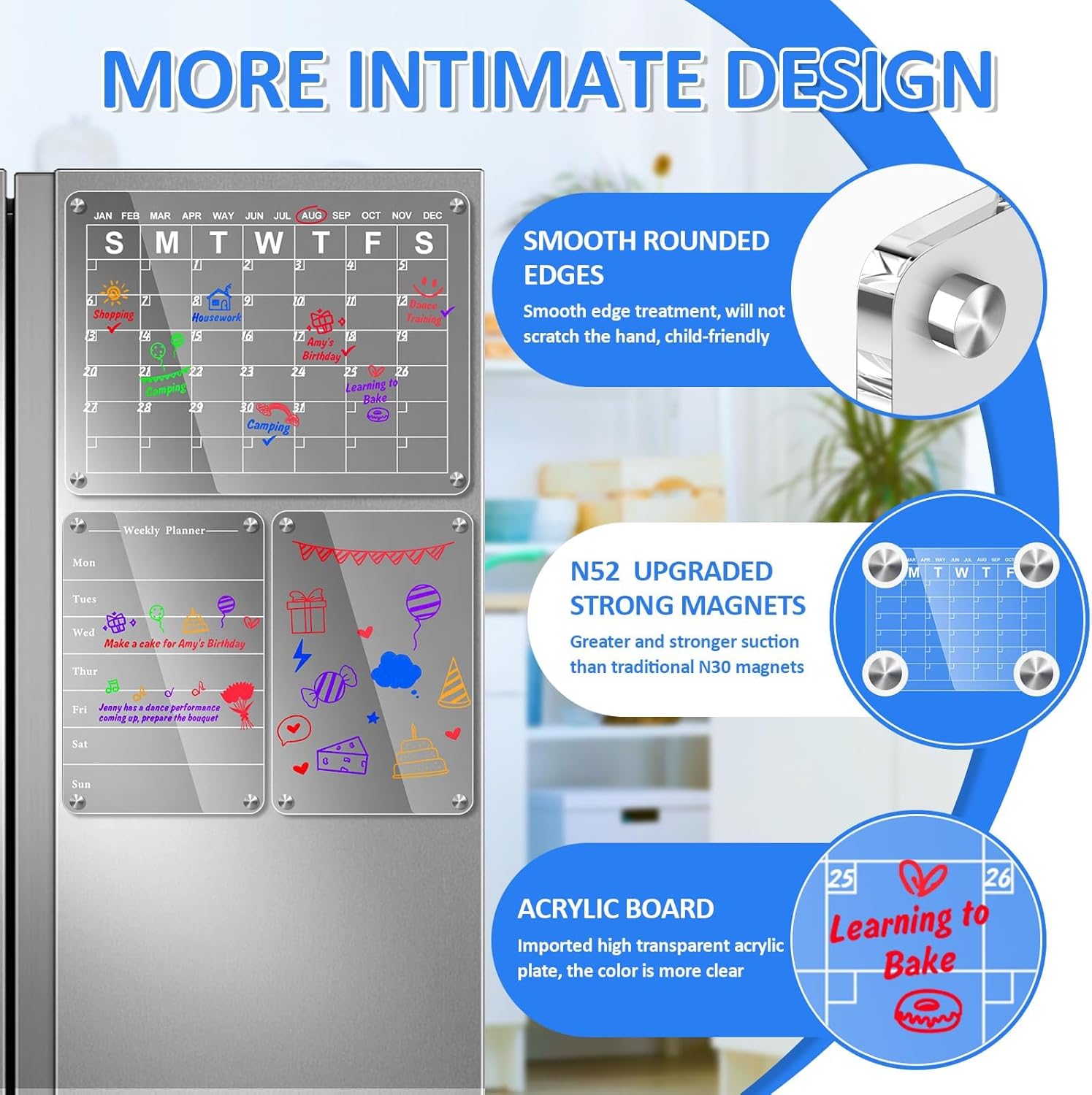 đăUPGRADED MAGNETIC DESIGN & READY TO USEă- Our acrylic magnetic dry erase board for fridge uses four N52 strong magnets that can be firmly attached to the refrigerator or most metal surfaces. With more suction than traditional N30 magnets, you won’t have to worry about it falling off! No installation required, just place on the refrigerator and use. 12 silicone pads are also provided to wrap around the magnet so that the magnet will not scratch your refrigerator.