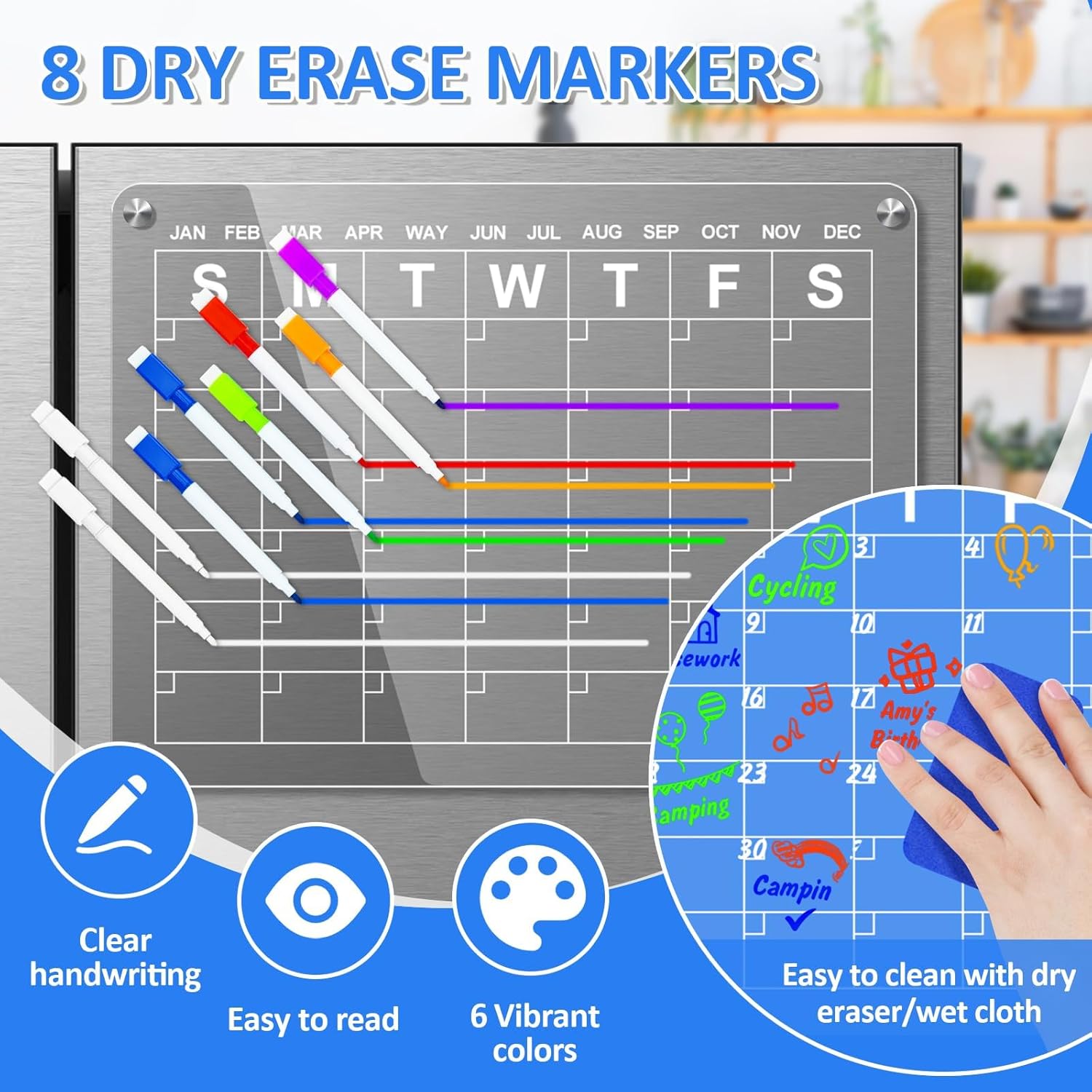 đăCLEARLY MARKED 8 MARKERS & EASY TO ERASEă- Our acrylic magnetic dry erase board for fridge includes 8 magnetic dry erase markers with cleaning tips in 6 colors: blue, red, white, green, purple, and orange. You can clearly mark your plans on the magnetic acrylic calendar for fridge with smooth writing and clear handwriting. We also have a magnetic dry erase for easy correction of writing errors and plan to content at any time without leaving any stains.