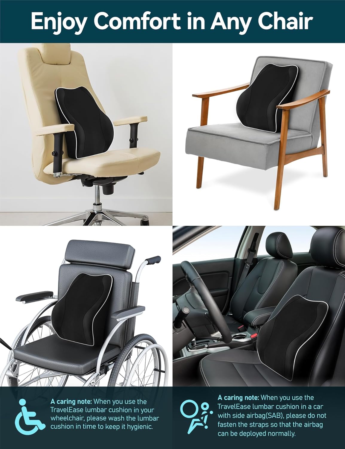 Universal Fit for Chairs: The TravelEase lumbar cushion is 43 x 40 x 11 cm. Our memory foam lumbar support is an ideal fit for most common chairs. However, it may not be suitable for some smaller-sized car seats. Please check the product dimensions to ensure the size fits your needs before purchasing. * When you use the TRAVEL EASE lumbar cushion in a car with side airbag(SAB), please do not fasten the straps so that the airbag can be deployed normally.