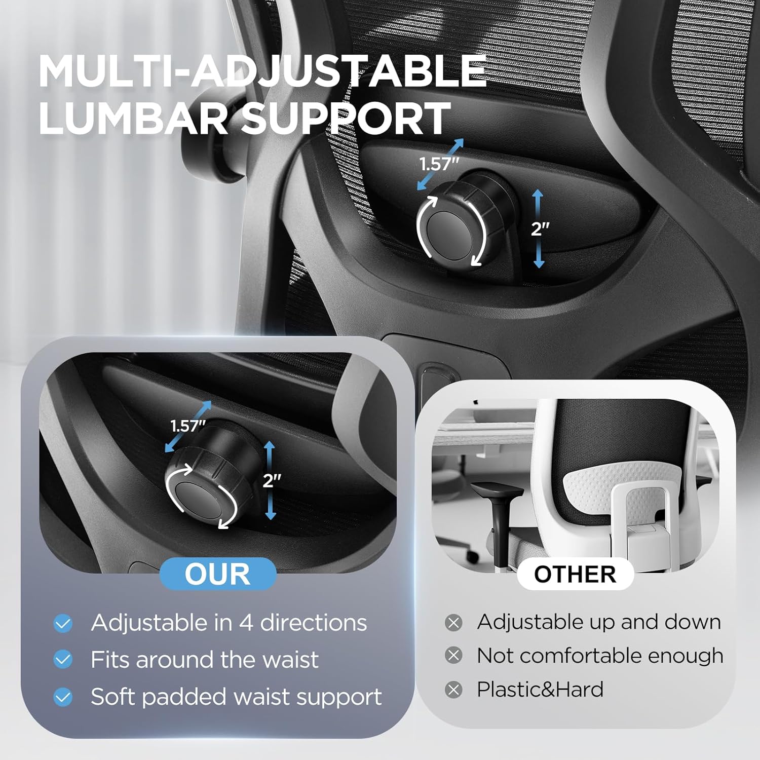 【Unmatched Comfort with Ergonomic Excellence】: Experience ultimate comfort with our ergonomic office chair, featuring an “S-shaped” backrest that perfectly contours to your spine for full-body support. The 2″ height & 1.57″ depth-adjustable lumbar support ensures perfect lower back alignment.Filled with high-density foam,it gently cradles your lower back to alleviate pain. The 2.4″ height-adjustable & 50° rotatable headrest offers tailored neck support for ultimate relaxation