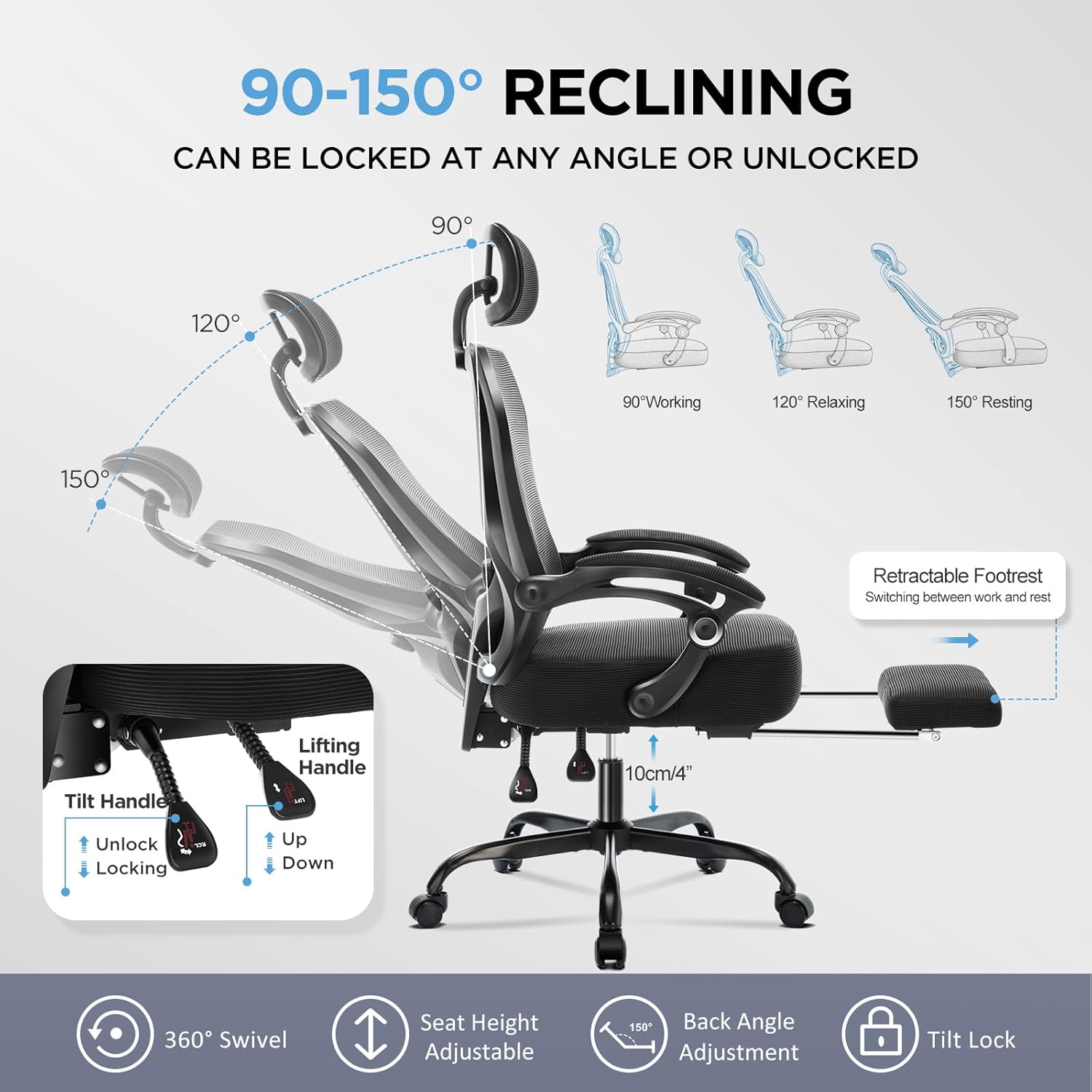 【Premium Adjustability for Every Need】:The office chair features 90°-150° reclining backrest and the footrest, allowing you to tilt back effortlessly and lock into your preferred angle for work or leisure. you can seamlessly transition from work to relaxation or take a nap. The versatile footrest can be used for cross-legged sitting.The 4″ adjustable seat height,360° swivel seat and 360° smooth-rolling wheels ensure effortless movement, making it perfect for multitasking in any workspace.