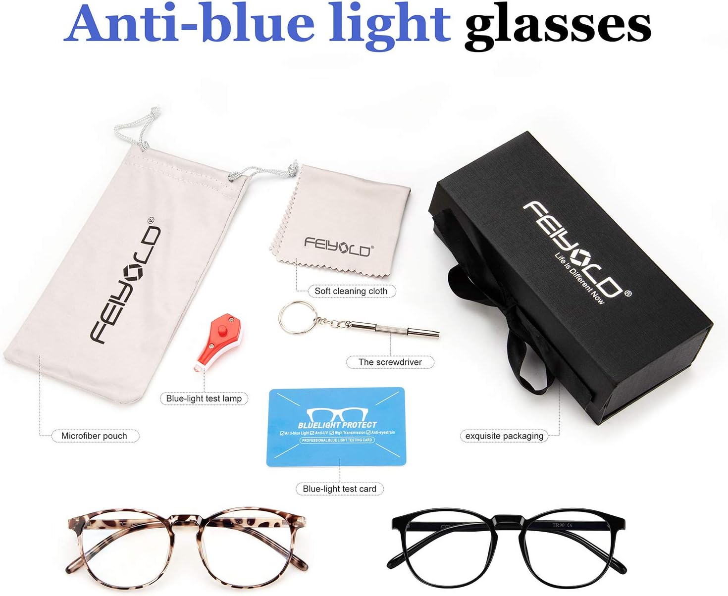 FEIYOLD blue light filtering glasses can block most of the harmful blue light and protect your eyes. You can enjoy your digital time without worrying about the hurting from blue light.