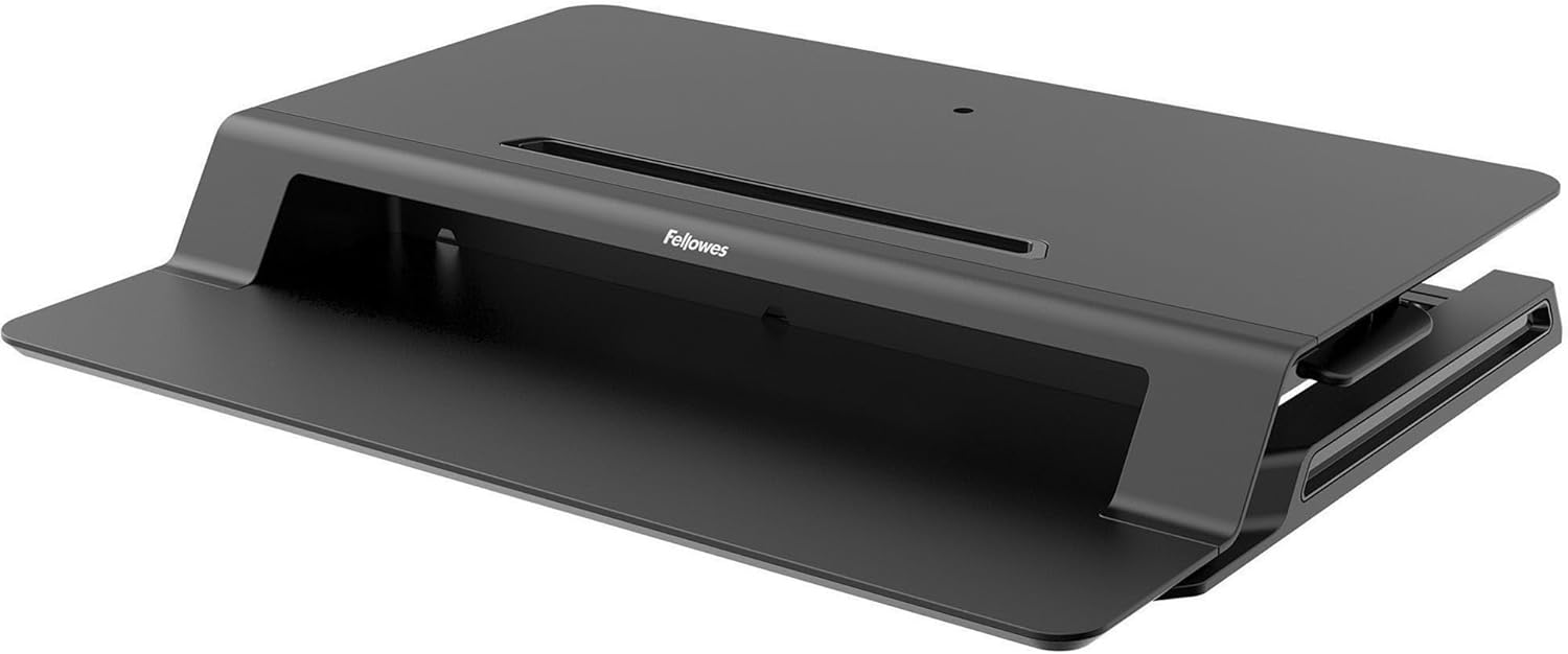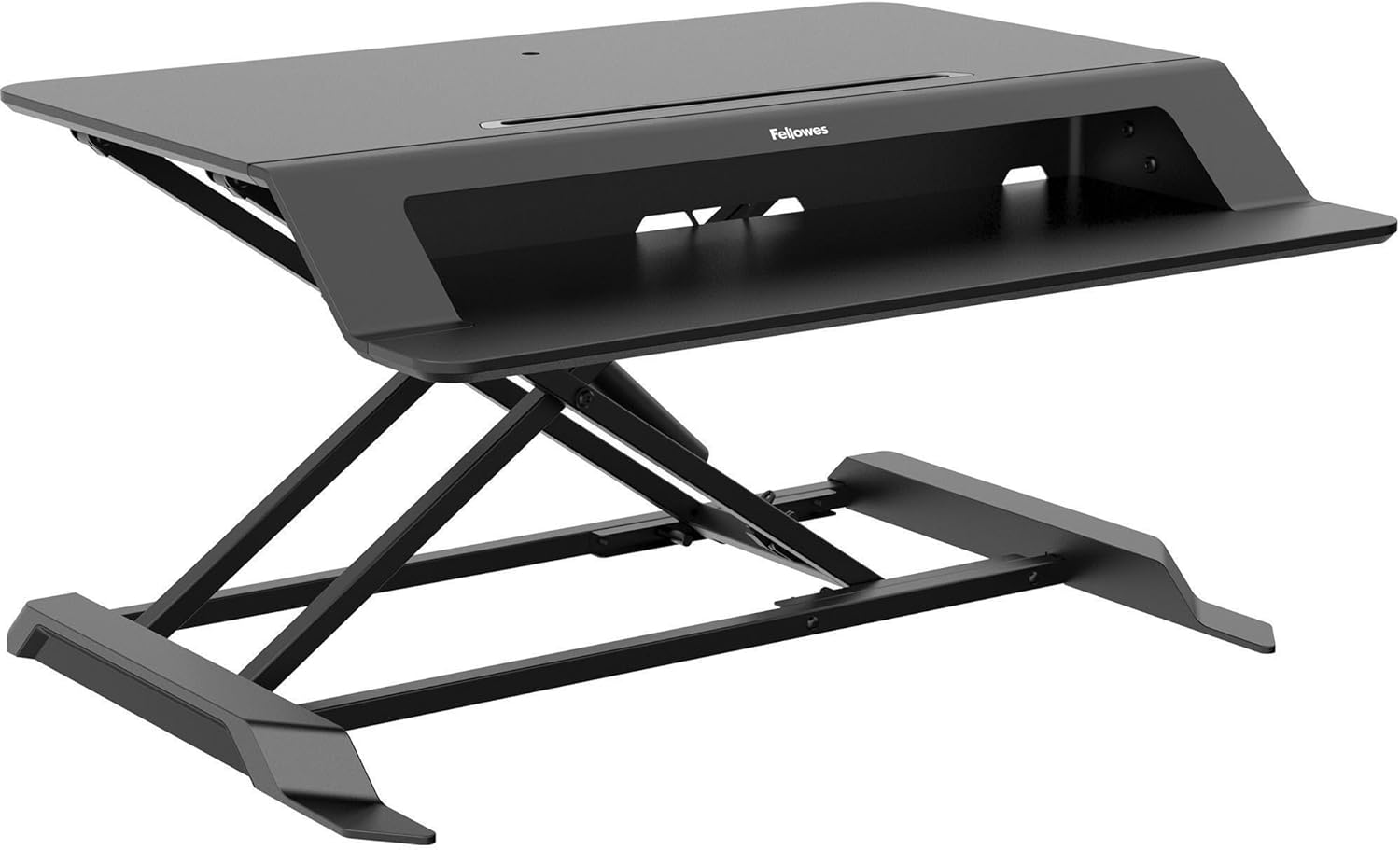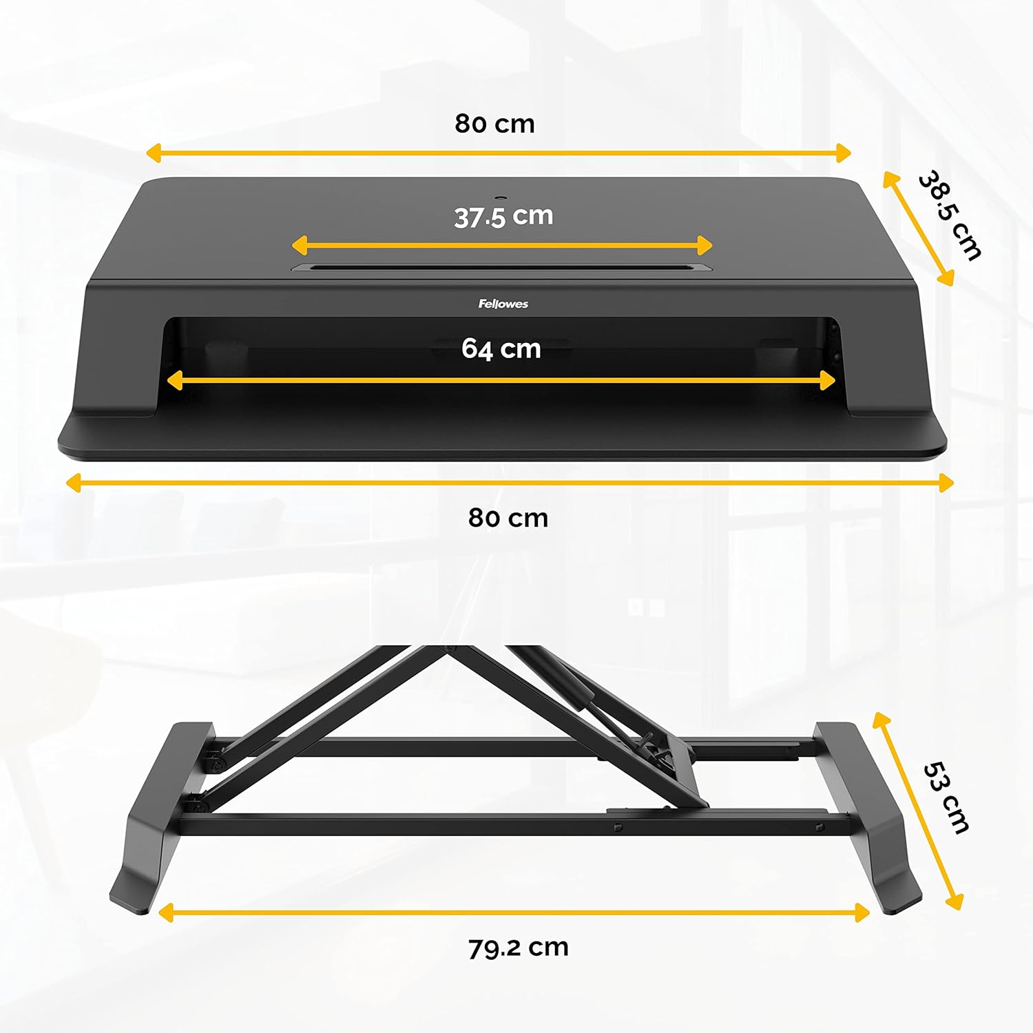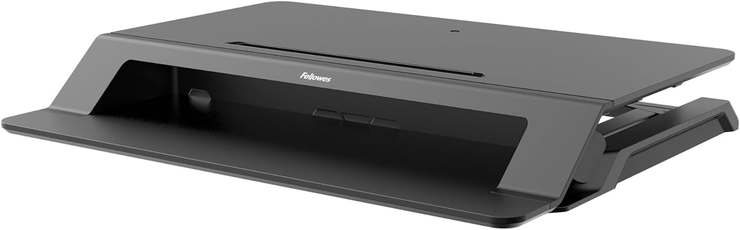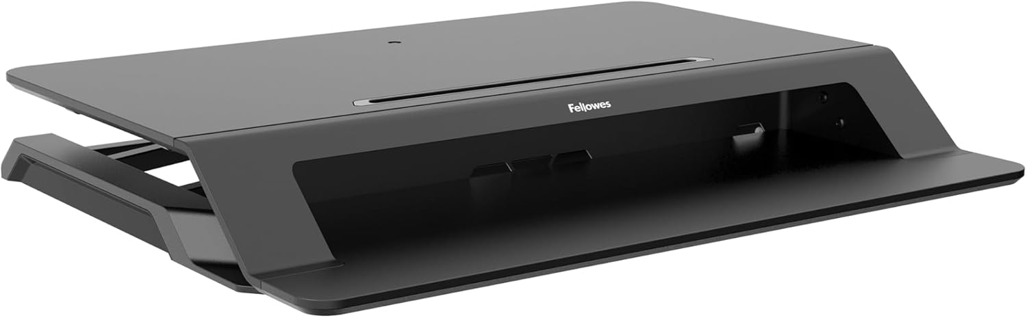 Sit-stand workstation features gas-spring height adjustment to effortlessly add movement to your workday. Spacious top platform offers enough space to hold two monitors or a monitor and laptop. The bottom level perfectly holds a keyboard and mouse. Keep your phone or other accessories within quick reach with the convenient device channel on the top platform. Compact size allows you to convert nearly any existing desk into a sit-stand workstation.
