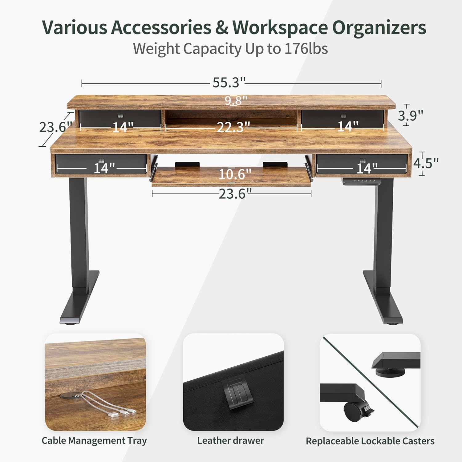 I don’t know how this design made it out of testing and into production, but it is truly awful. The finish arrived worn and bubbled in several locations. The lift platform is incredibly slow and will frequently throw an error while lifting (there seems to be absolutely no difference when changing the motor’s resistance/stability sensitivity). The back of the cable area is sealed and the only lip with clearance is the front of the desk (so no option for non-invasive monitor mounts). The drawers are fabric and faux leather, they fit very snug into the drawer openings but give no resistance when trying to pull them out so if there’s something even remotely heavy (>=500g) in the drawer, expect it to fall out and land on the ground. Save your money for something better.