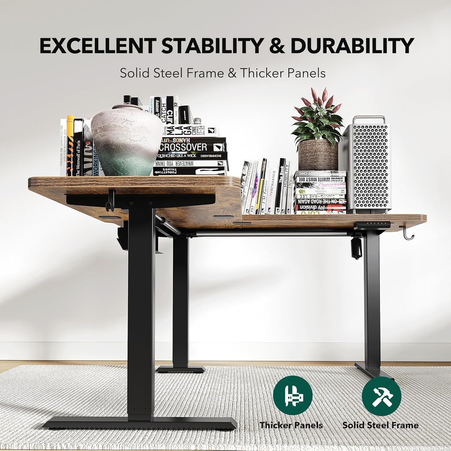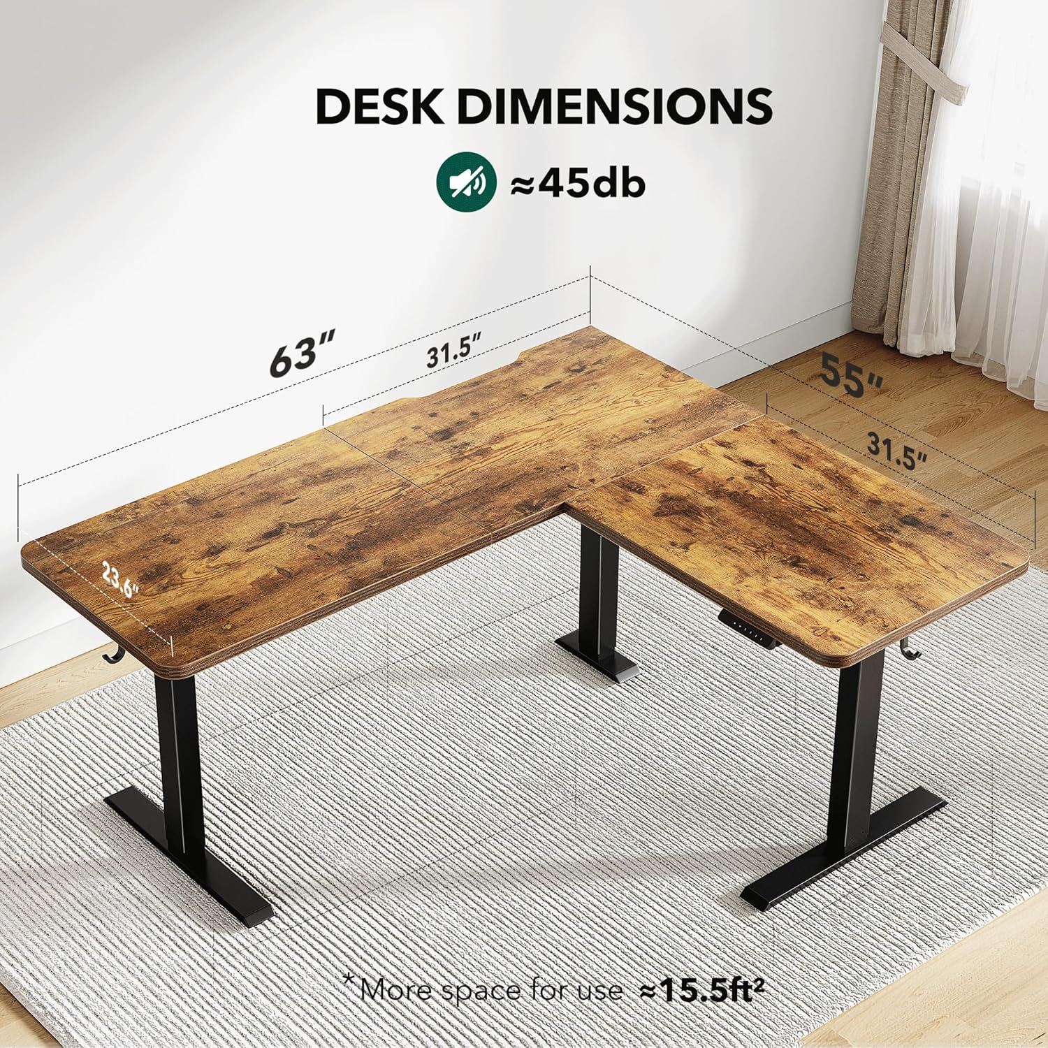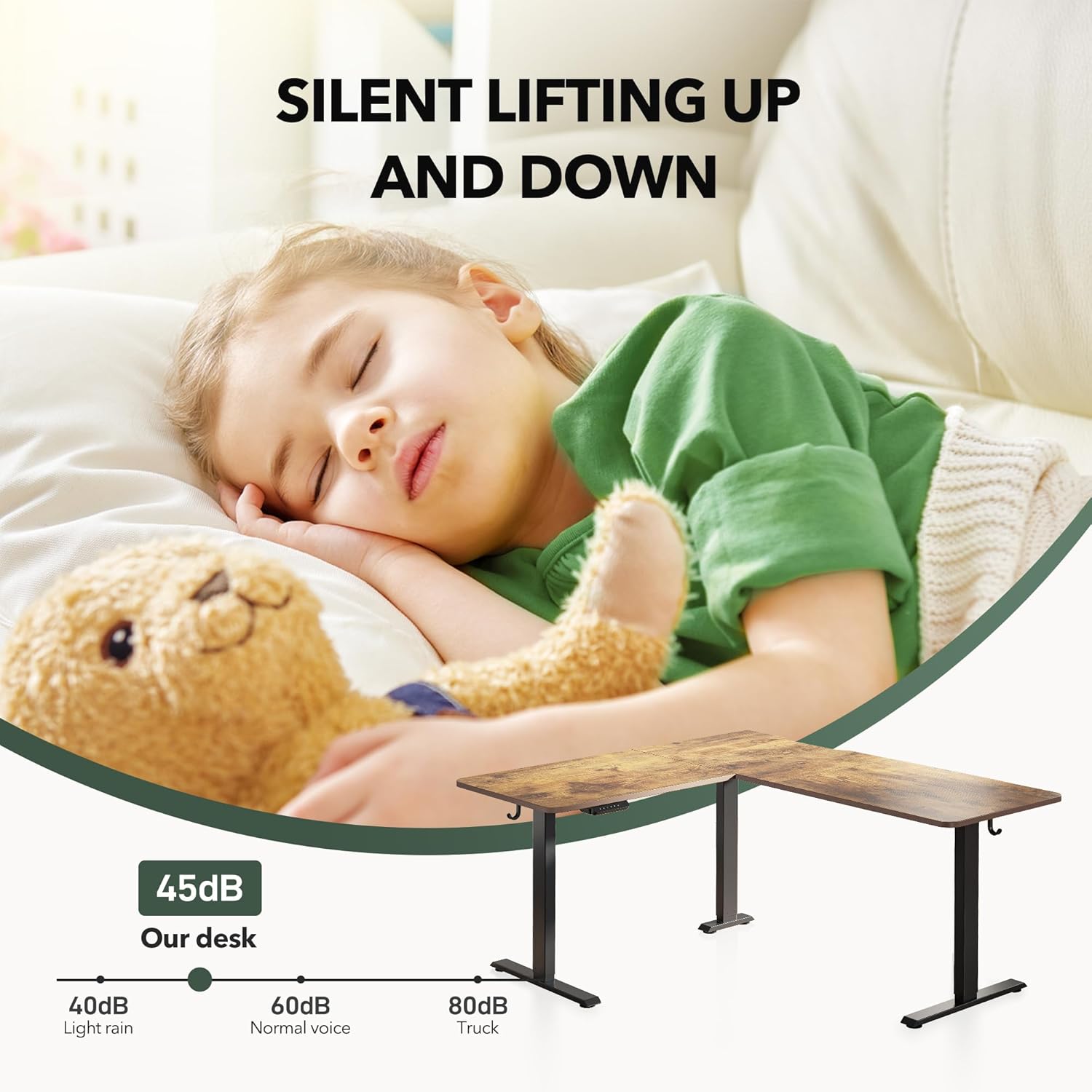 Powerful Lift System: The electric lift system with sturdy steel. The L shaped stand up desk contains an industrial-grade steel frame that able to support up to 176 lbs. Maximum lifting speed: 20mm/s, no-load noise≤55db.