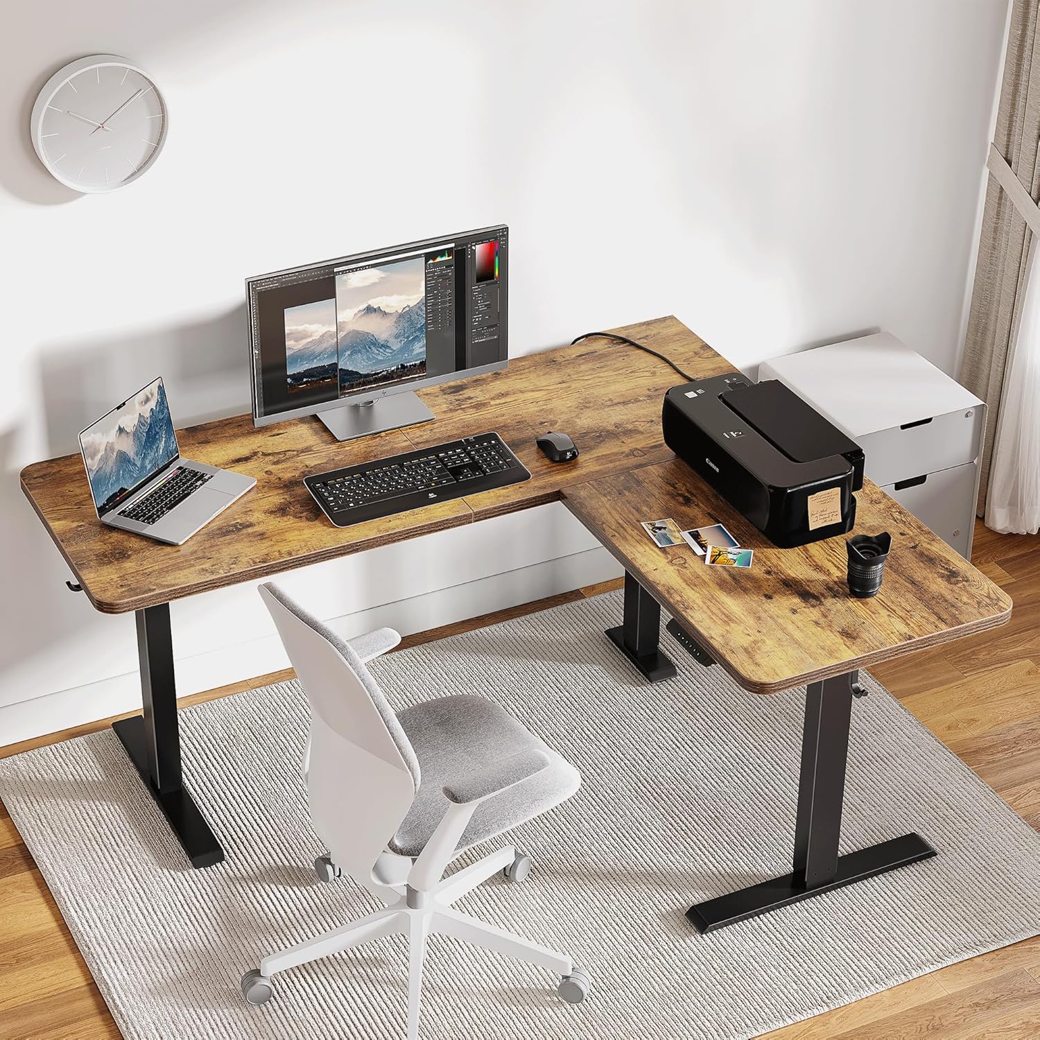 Height Adjustable Desk: Fezibo L shape standing desk has 3 preset memory buttons to customize your desired heights from 27.6″ to 46.9″ with collision-avoiding feature, smooth convert sitting to standing.