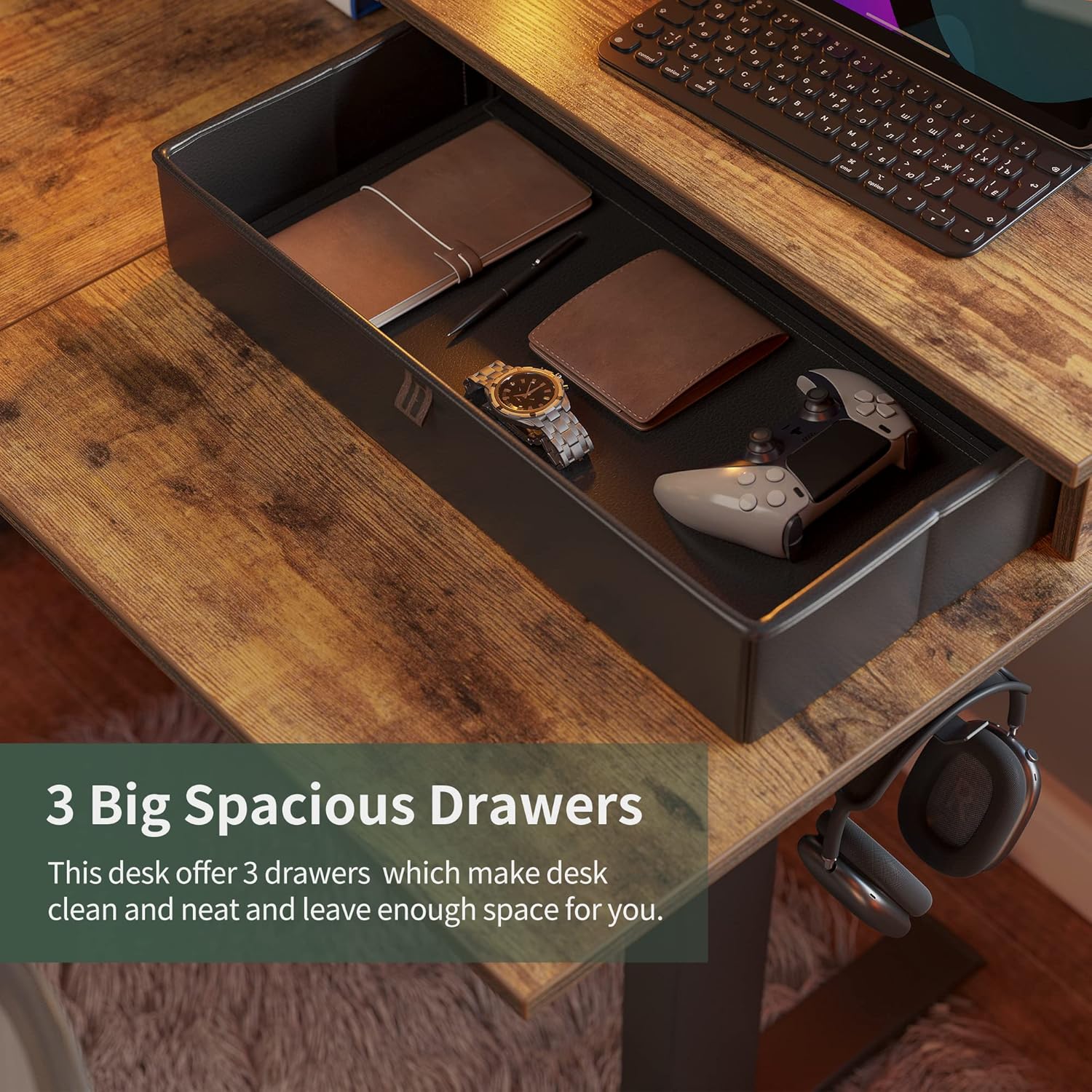 【Elegant Workspace】The 63″ L-shaped large work surface provides ample room, and 3 desktop drawers help you collect orderly.