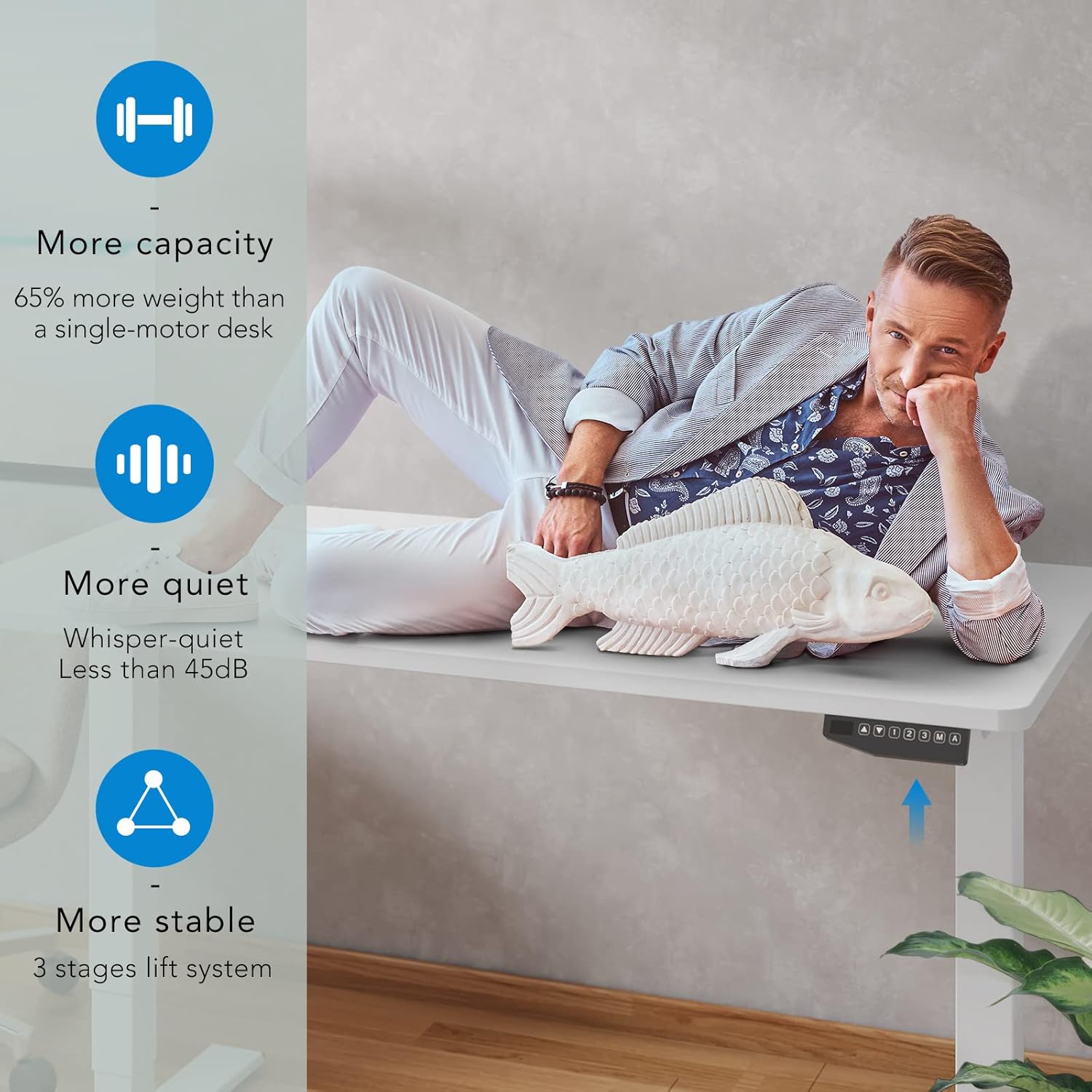 3 STAGES LIFT SYSTEM: Compare with 2 stages lift system, 3 stages standing desk has a 30% wider range of lifting space, from 24.4” to 50”. No matter 3’2” kid or 6’5” adult, you could adjust the height of your desk to suit them.