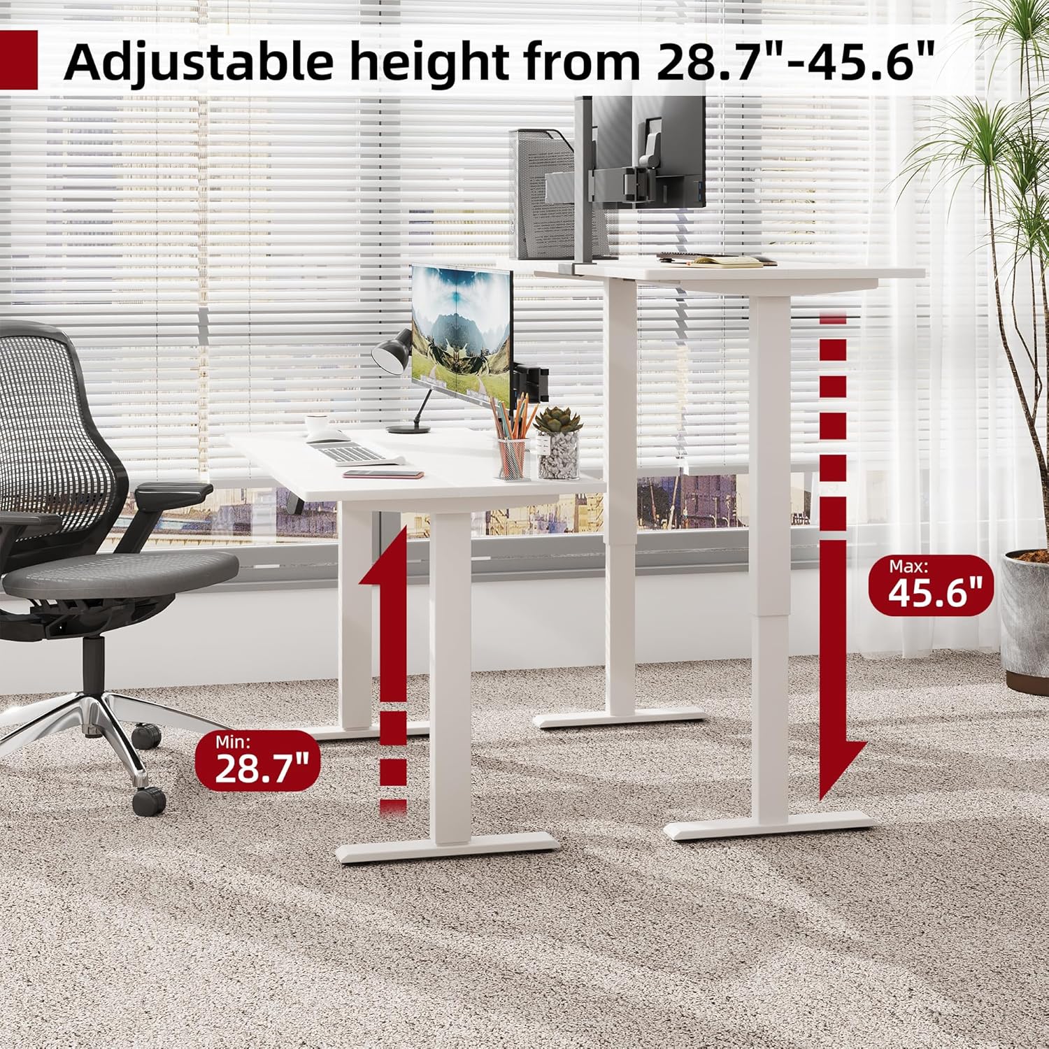 Smooth Electric Height Adjustment: Effortlessly transition between sitting and standing positions with the press of a button. The desk’s powerful motor ensures smooth and quiet height adjustments, providing a customizable experience for any user. The height can be adjusted from 28.7” to 45.6” and you can freely adjust it to the height you want.