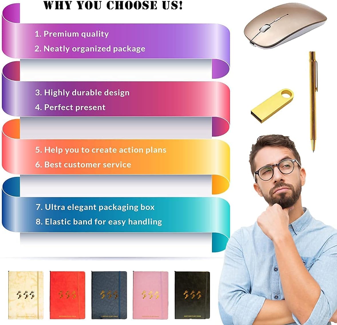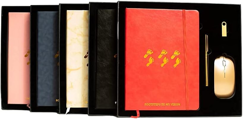 JOURNAL SET ACCESSORIES: This leather portfolio for men and women comes with everything you need for a complete and satisfying experience, including a vision board planner, luxury pen having a great grip, 8GB USB flash drive with mini size allows you to store the information you want to record, keep your digital world in your pocket, wireless portable mouse which is packed in a super elegant box.