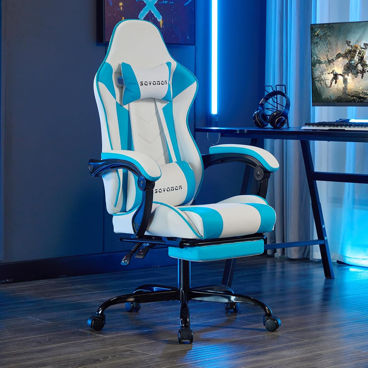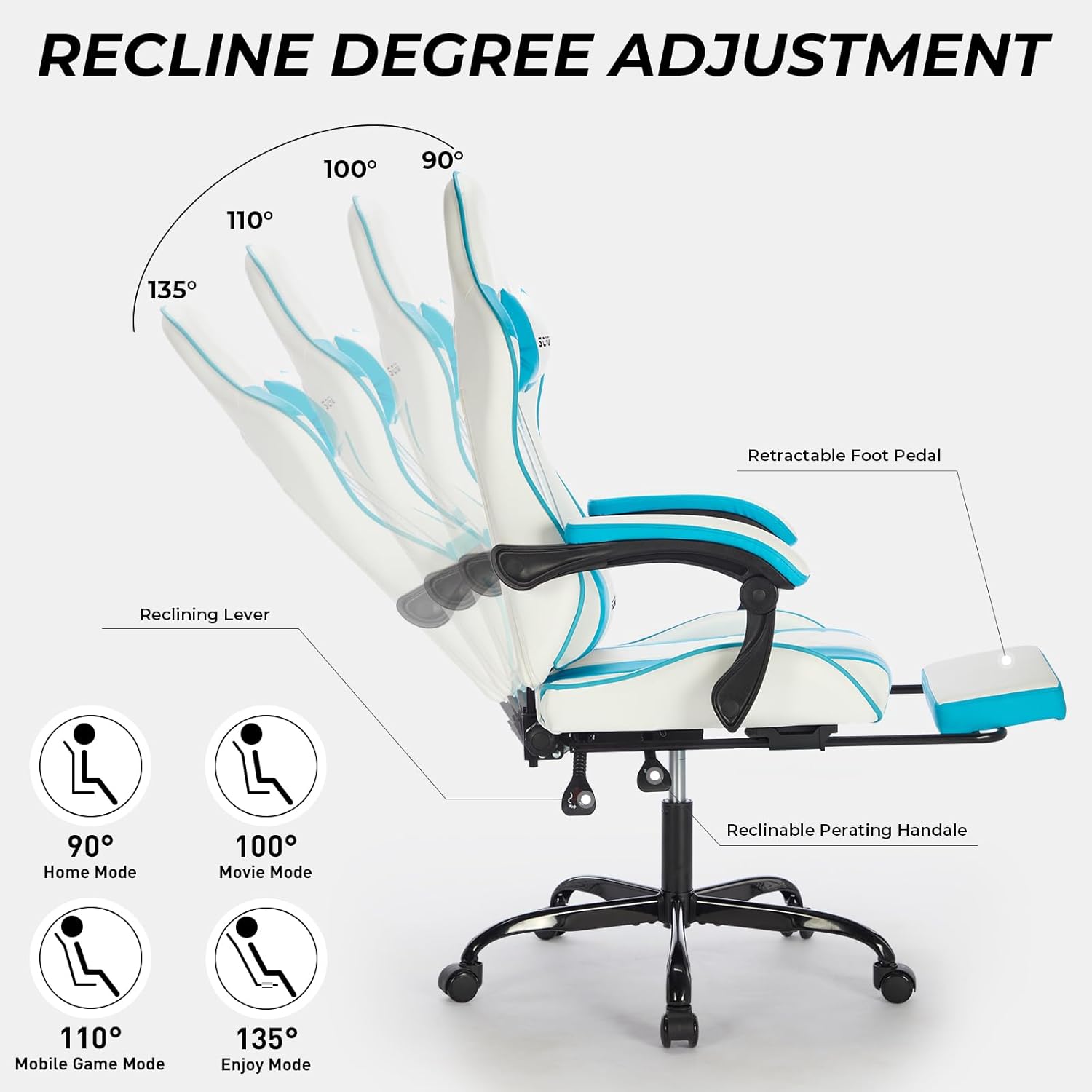 Ergonomic Design: The ergonomic curved high backrest of this comfortable multi-functional gaming chair provides full support for your entire body. Features massage lumbar pillow, headrest, retractable footrest video game chairs, sits on PU rolling casters that rotate 360°best gaming chair for maximum mobility and supports up to gaming chairs for adults 330lb