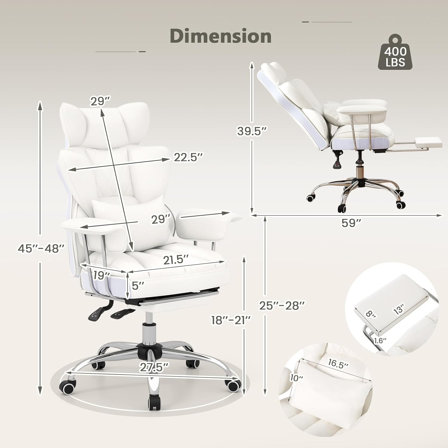 [Heavy-duty Office Chair]: To achieve smooth movement, the executive chair features 5 universal wheels. Meantime, its SGS gas rod and 5-claw strong supporting metal base, all tested over 100,000 times and certified for safety and quality, which will provide a substantial load capacity of 400 lbs. BIFMA certified.