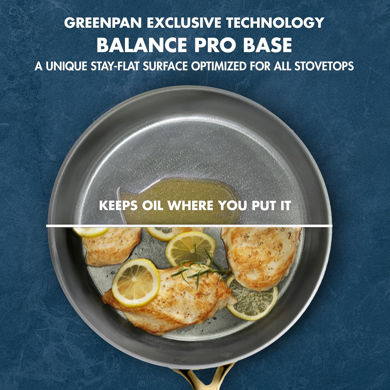 BALANCE PRO BASE: Each frypan and sauté pan have unique stay-flat bases designed to flex when heated, so oil stays where you put it and you can use less.