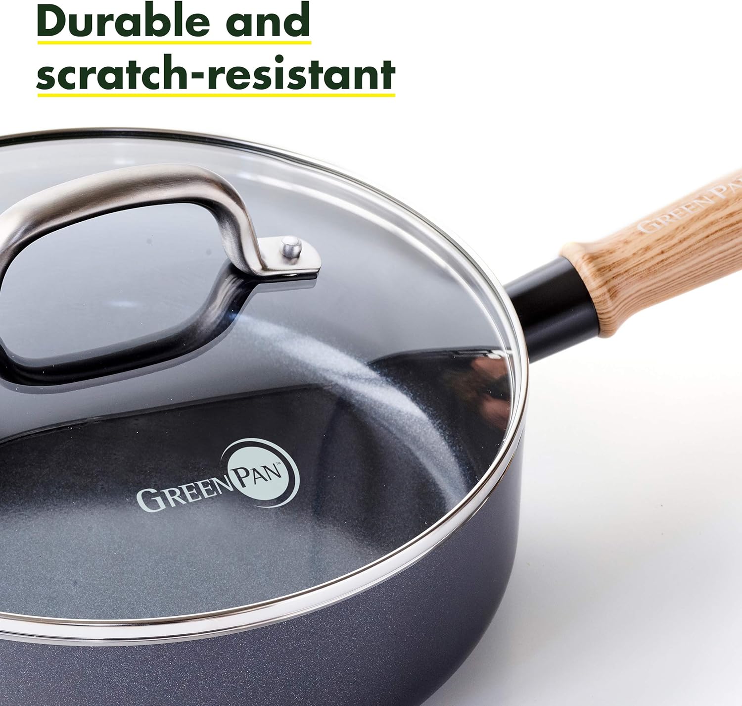 A refined take on rustic, the GreenPan Hudson collection gives you contemporary comfort with a classic vibe. Perfect for side dishes and sauces, this saucepan gives you throwback style with high-performance ceramic nonstick ease. Hudson takes its vintage look from the past but is crafted with modern cooks in mind. The durable collection features tough hard anodized bodies and stay-cool Bakelite handles with a striking wood finish. A durable glass lid gives you an easy view of your meals. The pan is finished with our Thermolon healthy ceramic nonstick coating, which is reinforced with diamonds for extra strength and better nonstick release. It’s also free of PFAS, PFOA, lead, and cadmium and will never release toxic fumes, even when overheated. Dishwasher safe. Oven safe up to 320°. Limited lifetime warranty.