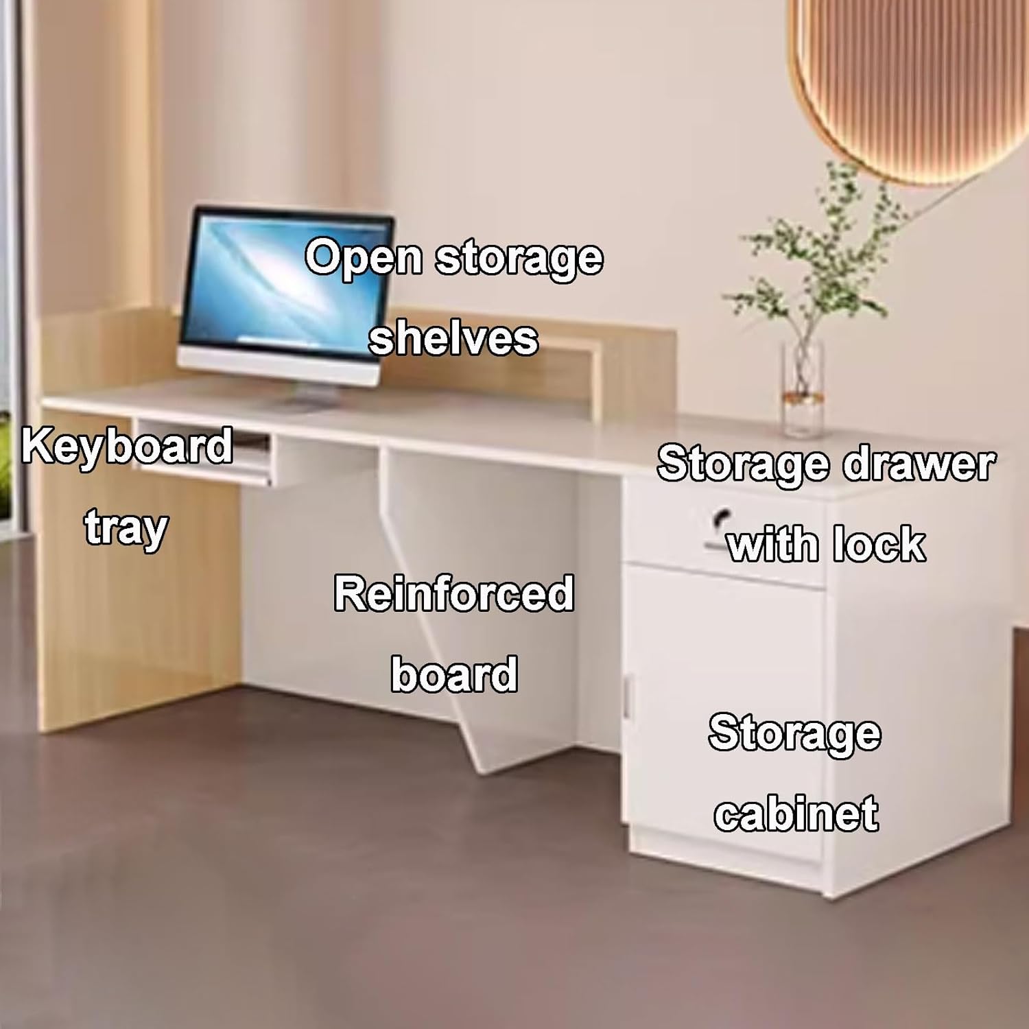 Storage: featuring large inner storage space (storage cabinet and storage drawer with lock), modern reception standing counter could store files and work essentials with privacy and security