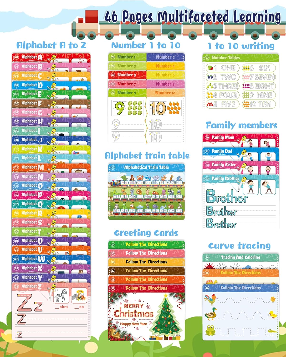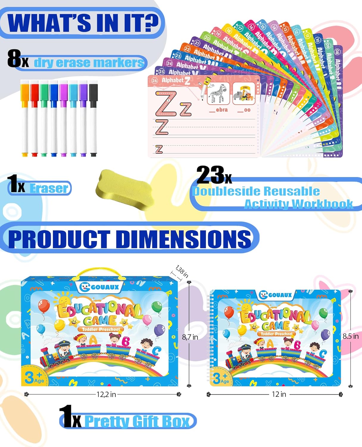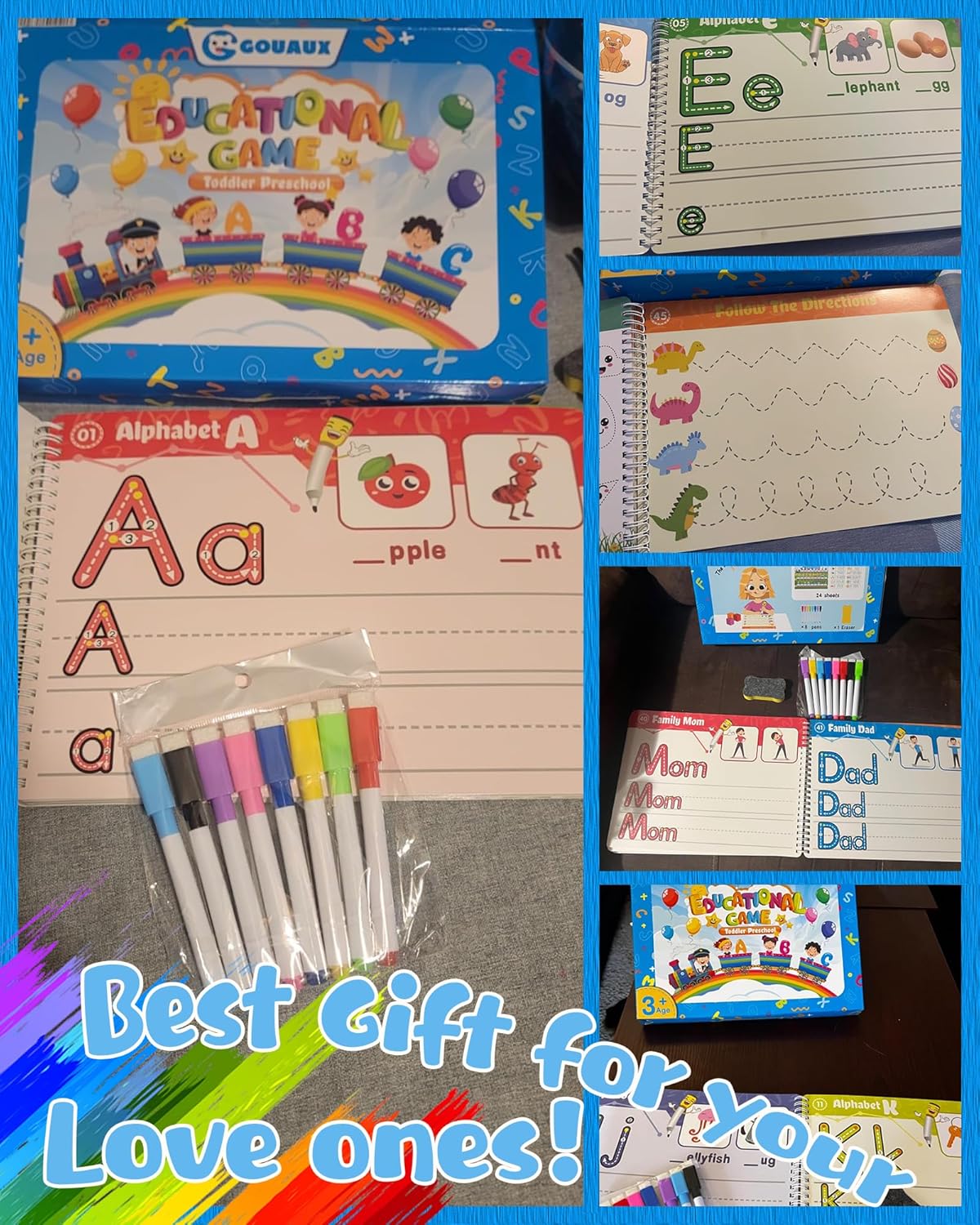 What You Will Get – Our preschool workbook come with a nice gift box which include 46 Pages Reusable Practice Copybook for Kids, 8 different colored and erasable pens and 1 eraser (Multiple Themes of Tracing Lines/Alphabet Practice/Number Practice/Tracing & Coloring/Words Practice/Animal Alphabet Train)