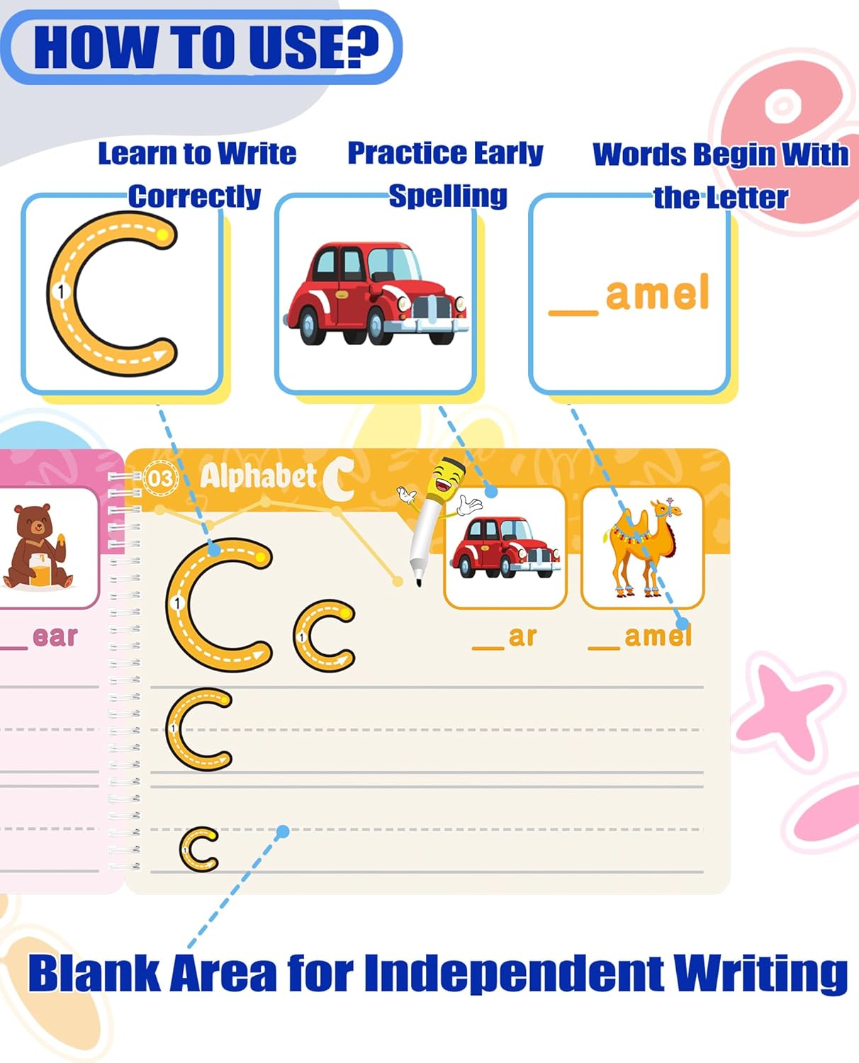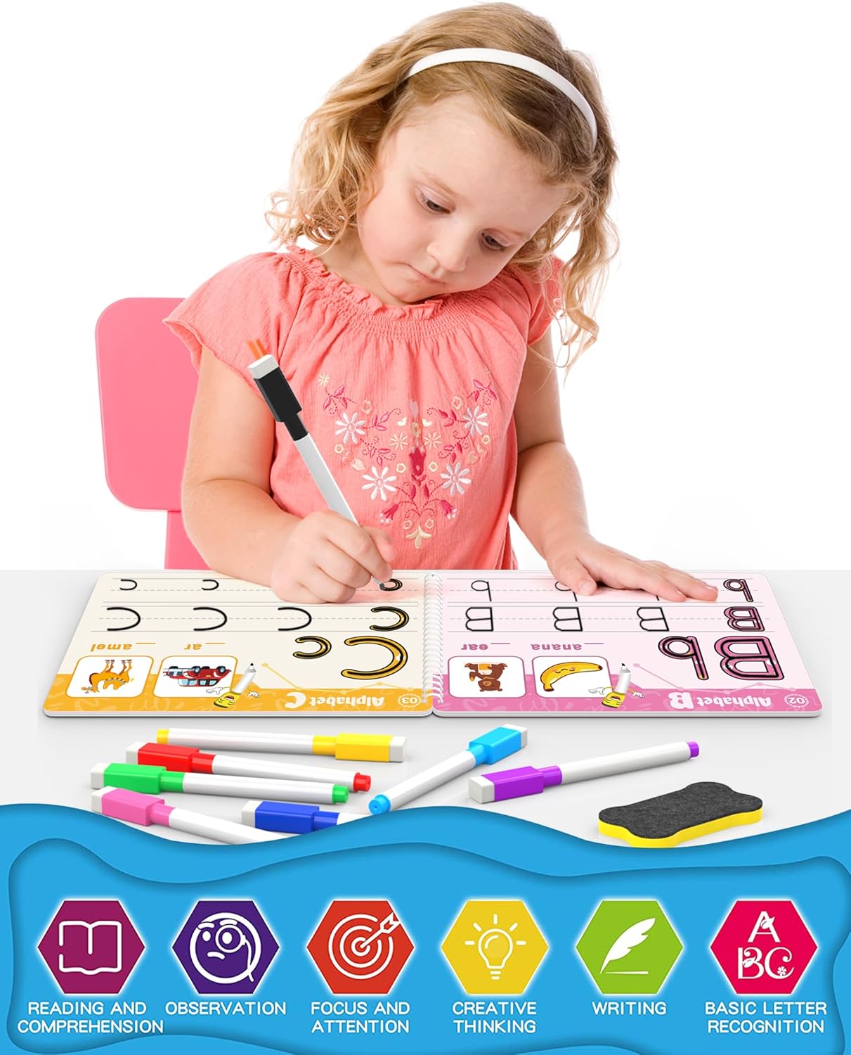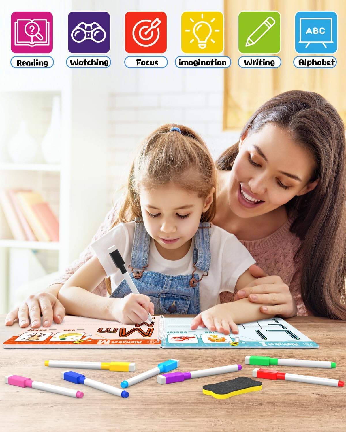 What You Will Get – Our preschool workbook come with a nice gift box which include 46 Pages Reusable Practice Copybook for Kids, 8 different colored and erasable pens and 1 eraser (Multiple Themes of Tracing Lines/Alphabet Practice/Number Practice/Tracing & Coloring/Words Practice/Animal Alphabet Train)