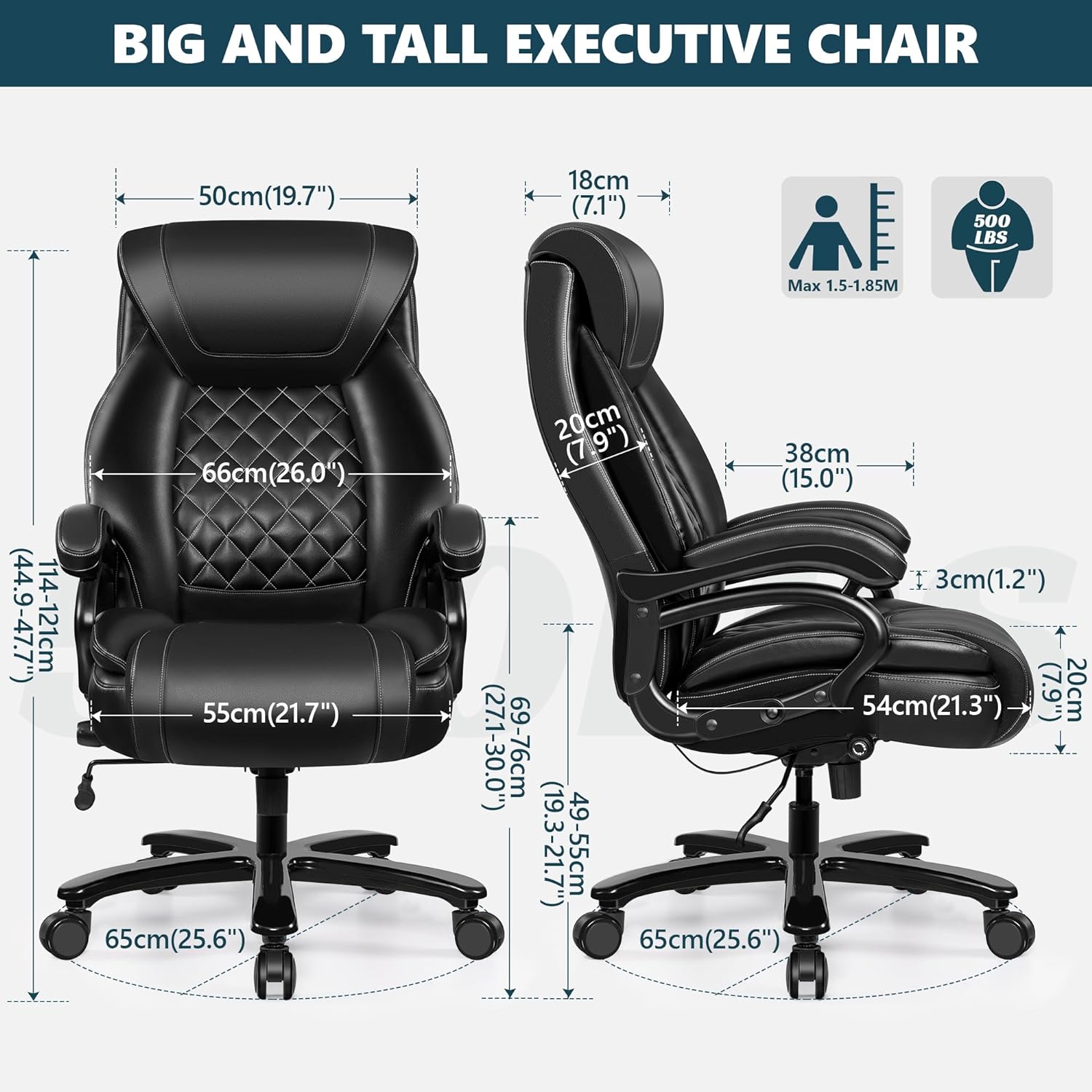 As a person who often finds typical office chairs flimsy and uncomfortable due to my larger frame, this chair has been a game changer! From the moment I assembled it, which was straightforward and took about 30 minutes, I could tell it was built to last. The heavy-duty construction confidently supports up to 500lbs without any creaking or wobbling, a testament to its solid design.The wide seat is a dream come true, providing ample room that I’ve rarely found in other chairs. Covered in a plush PU leather, it not only looks sleek and professional but also offers a comfortable sitting experience for prolonged periods—essential for those long work hours. The adjustable lumbar support and the rocking feature are particularly beneficial, allowing me to find the perfect position for optimal back support and some much-needed relaxation during breaks.One thing to note is the chair’s substantial size; it definitely requires a spacious area to fit properly. However, this is a minor caveat considering the comfort and support it provides.Overall, I highly recommend this executive desk chair to anyone who struggles to find robust seating options. It’s an investment for your comfort and health, making it an excellent choice for both home and office environments. Whether you’re working on a project, attending virtual meetings, or just browsing the web, this chair keeps you comfortable and supported throughout the day.