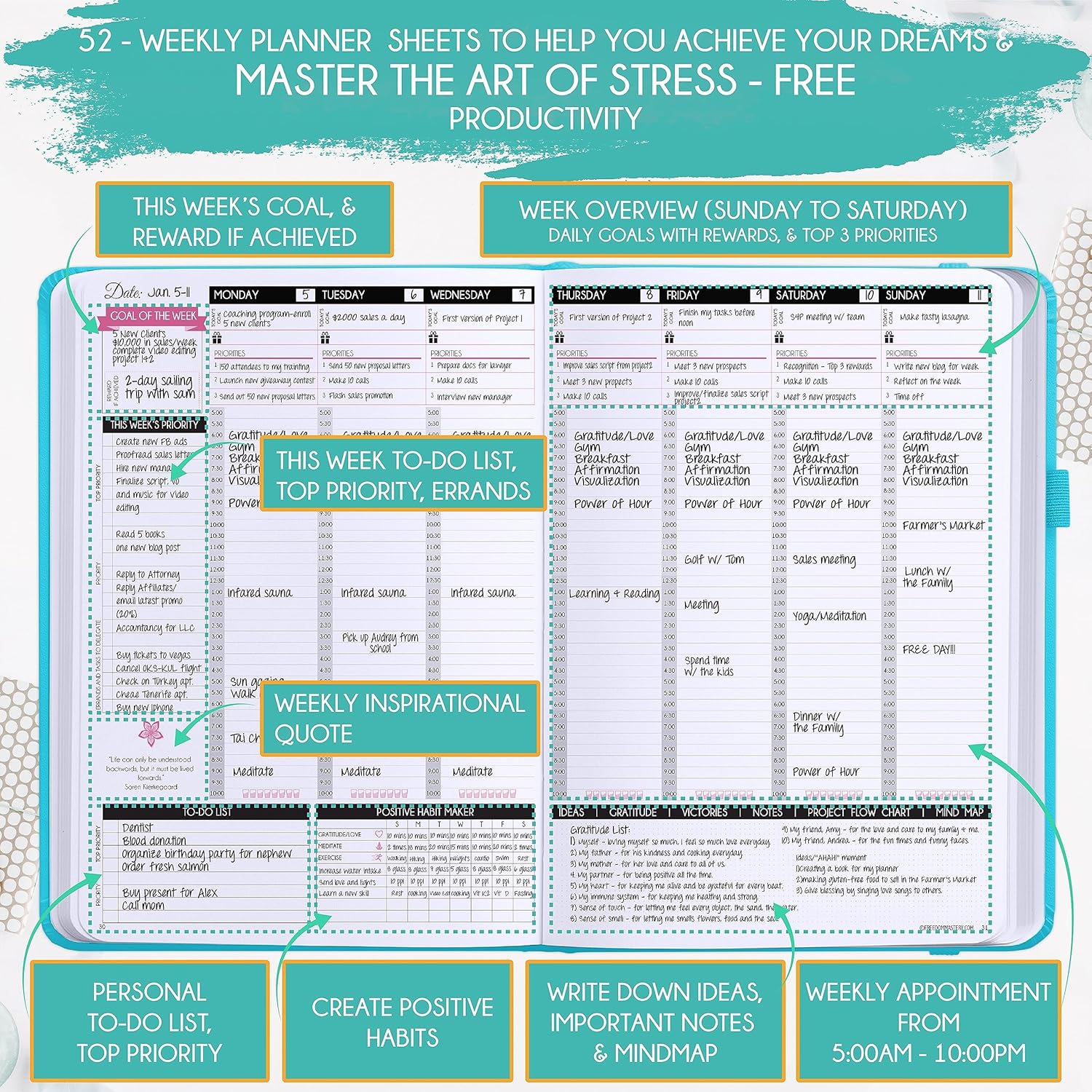 ACHIEVE YOUR GOALS USING THE LAW OF ATTRACTION – Learn how to set big goals, be happy and manage your time well, and follow the same methods millionaires around the world use to set goals and achieve them. This monthly planner undated planner, life planner, hourly planner, yearly planner, work planner, schedule planner or appointment book. It’s a perfect planner for women and men.