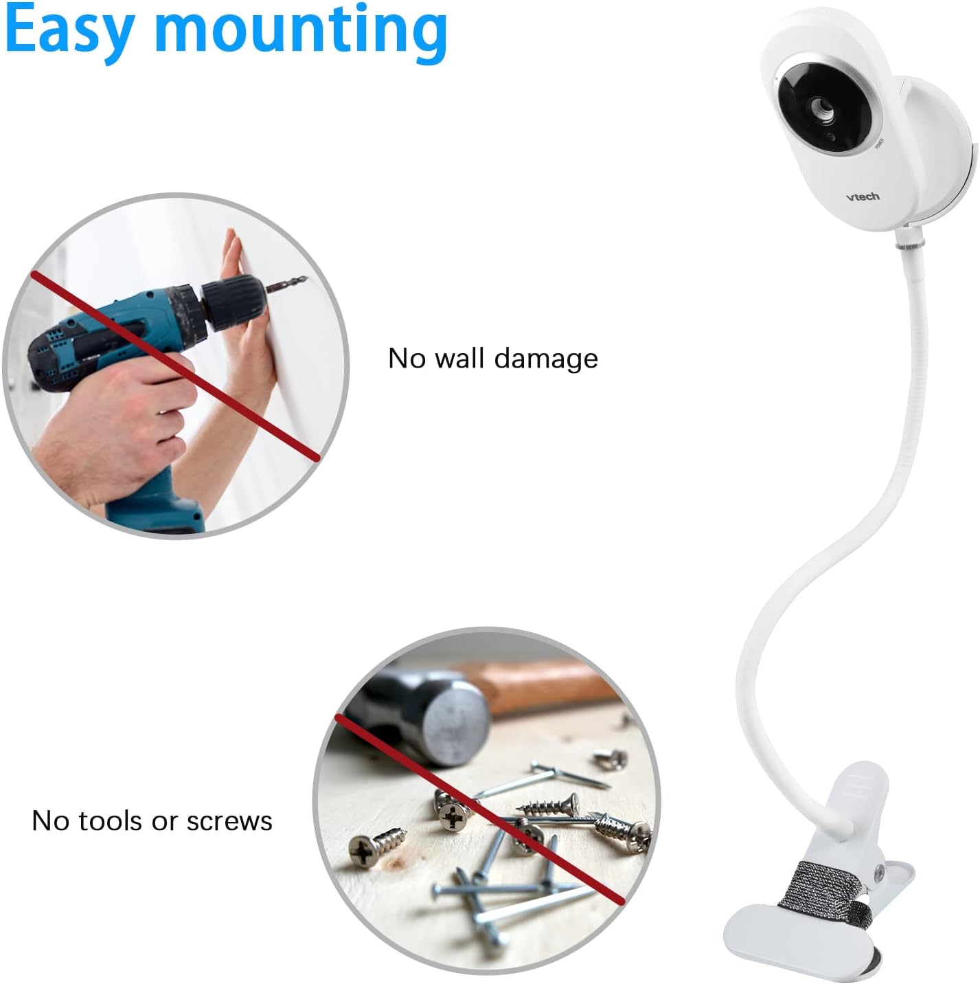 Huafly Baby Monitor Clip Mount for VTech VM350/VM320 Video Baby Monitor with Adapter Base,No Drill and Without Wall Damage Bracket, Indoor Home Security Flexible Baby Camera Holder