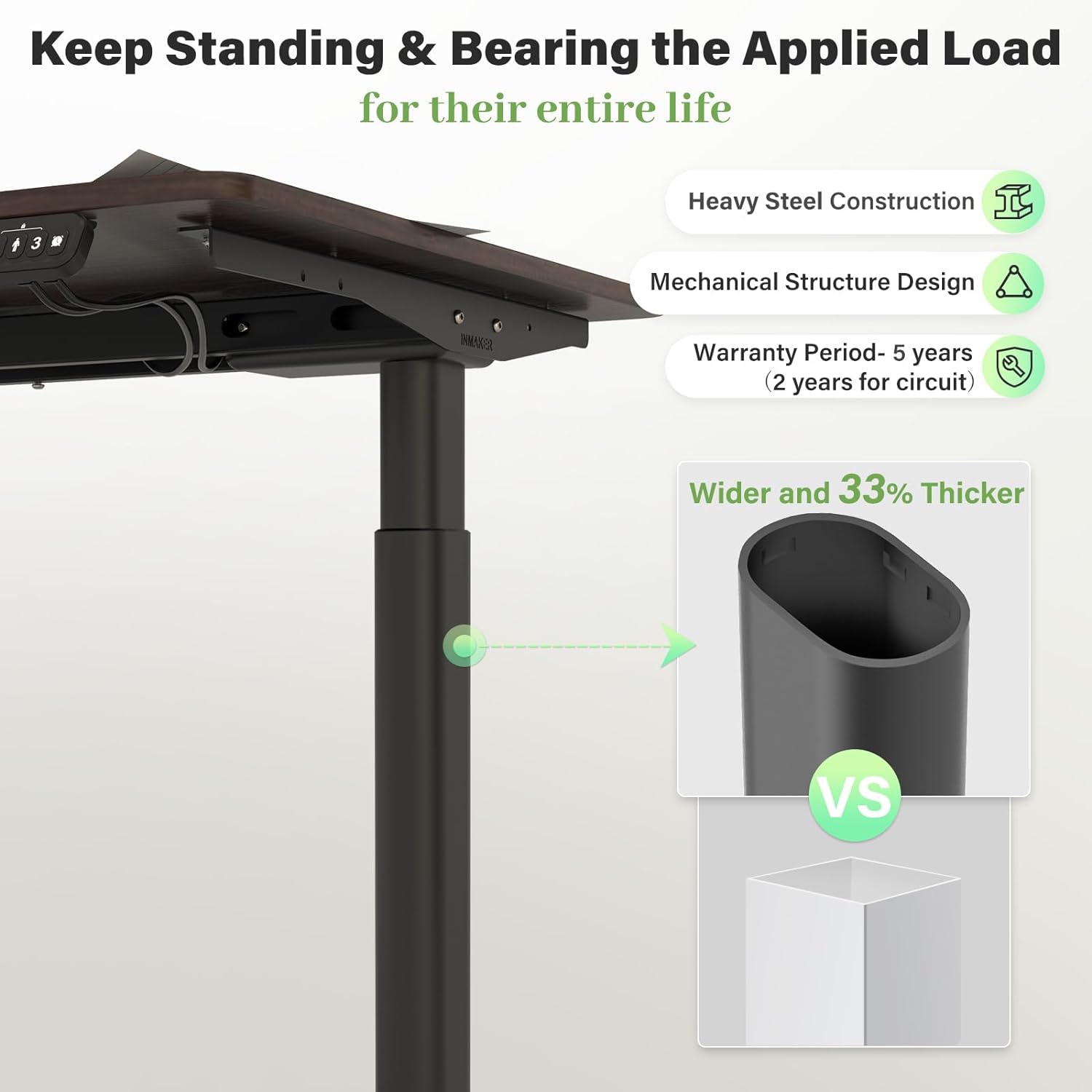 【Sustainable partner】Adjustable Desk Frame is made with 33% thicker steel, providing greater load capacity up to 220lbs (100kg). After tens of thousands times of weight cycle lifting test, the dual motor standing desk frame with mechanics-based design is still stable as the original. Sit stand desk frame’s durability is beyond question, for which INMAKER offers a 5-year warranty (2 years on the circuit part).