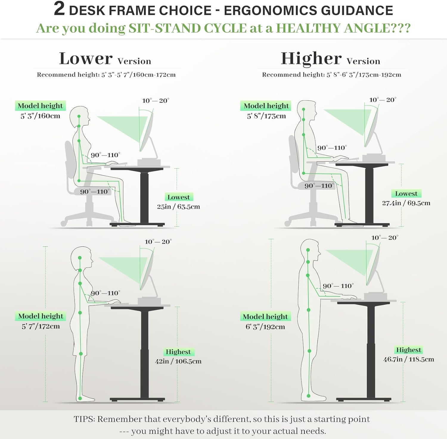 【What’s best for you?】INMAKER Standing Desk Frame designs for more desk dwellers based on scientific ergonomics. Sit stand desk frame have both higher and lower versions, among which the adjustable range of high version is 27.4″-46.7″ (69.5—118.5cm) and the lower version is 25″-42″ (63.5—106.5cm). Please read the ergonomics guidance on the pictures before purchasing. Standing desk legs flexibly promote turning a sedentary work environment into one with movement, so as to reinforce all-important work-life balance.