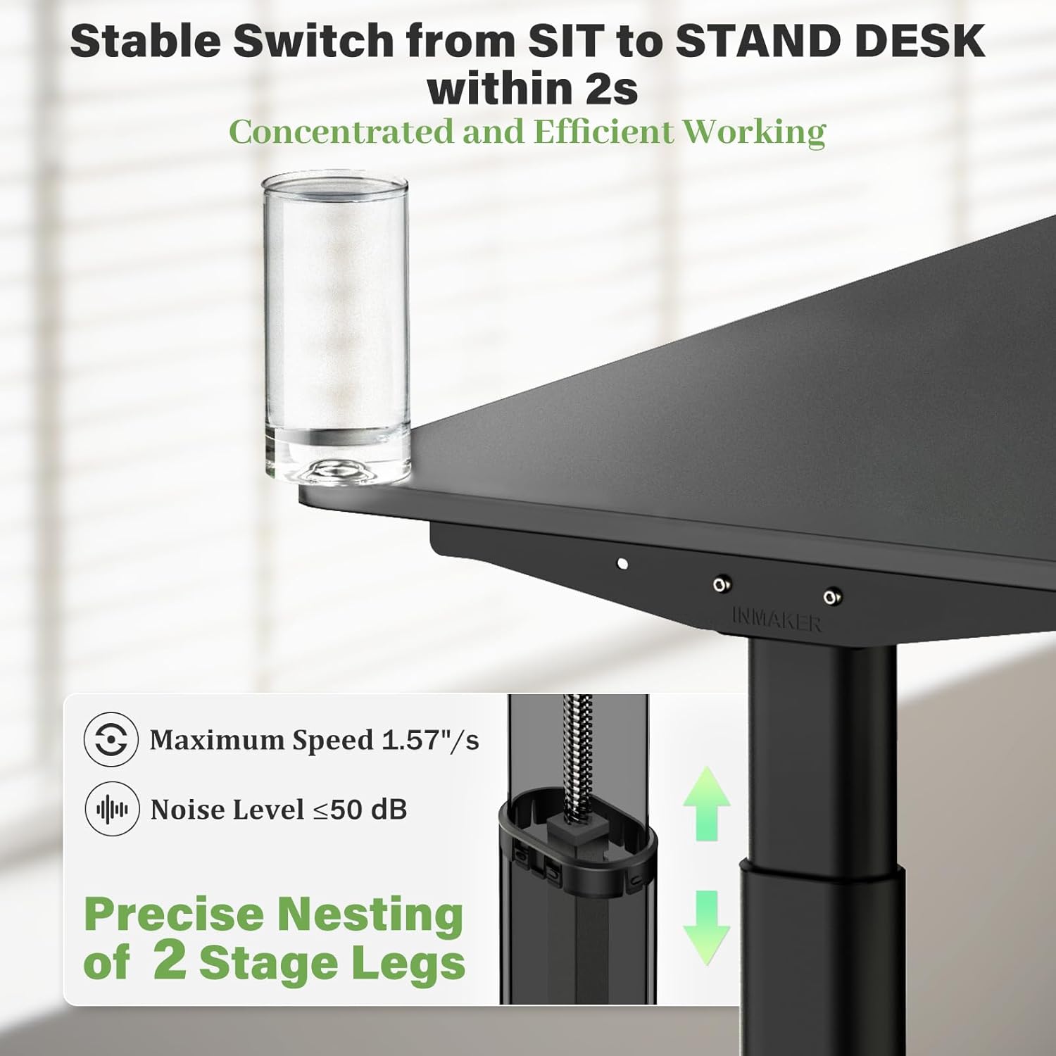 【Switch from Sit to Stand Desk within 2s】INMAKER Electric Lifting System is equipped with precise nesting of two stage legs combing with its precise mechanical drive shafts internally. Furthermore, standing desk frame dual-motors of superior quality drive smooth and fast lifting, whose maximum motor speed is up to 1.57″/s (40mm/s) and operation sound is ≤ 50 dB.By connecting with the handset, adjustable desk frame switch the heights with great ease, so as to increase working efficiency and concentration.