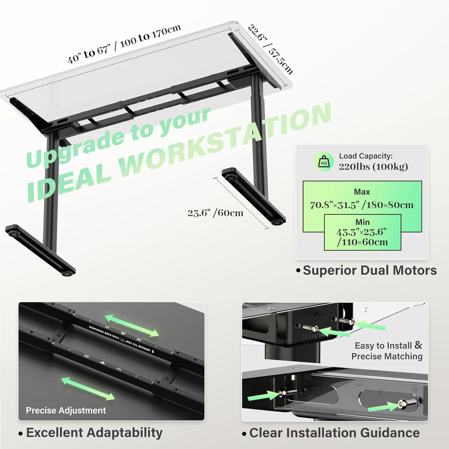 【Everyone can be DIY adept!】We repeatedly test the assembly precision of desk frame to ensure smooth installation. Additionally, INMAKER provides clear installation guide and video, as well as installation tools and components in full-set. Standing desk base is suitable for desktop in length of 43.3″-70.8″(110-180cm) and in width of 23.6″-31.5″(60—80cm), providing most free in matching different sizes and types of desktops. Decorate a desk that fits your personality, space and style!